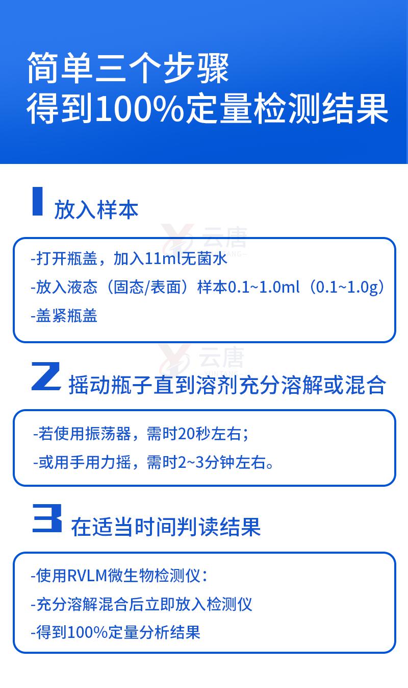 | 1.每種微生物快速檢測試劑瓶檢測不同微生物,試劑瓶內(nèi)含有針對特定微生物類的氧化還原酶。當被微生物污染的樣品插入試劑瓶后,氧化還原酶會發(fā)生化學反應,導致瓶中液體的顏色發(fā)生變化,液體顏色會根據(jù)瓶中微生物的數(shù)量發(fā)生變化。 | 2.含樣品的試劑瓶可放置在30oC,37oC或44oC的小型細菌培養(yǎng)箱中,或放置在MBS微生物快速檢測儀中進行 | 3. MBS微生物快速檢測儀,可同時對8個試劑瓶(八份不同菌種樣品)獨立地檢測,分別控制溫度,并分別給出定量分析報告。分析報告通過單獨安裝的軟件進行讀取,軟件適合系統(tǒng)包括:Windows XP、Vista | 4.使用后,按壓容器口將氯基溶液添加到容器內(nèi)以此殺菌,容器內(nèi)微物幾分鐘可殺死達到消毒目的。 |