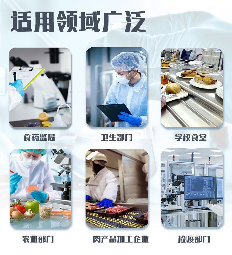 該病害肉檢測(cè)儀為集成化食品安全快速檢測(cè)分析設(shè)備,目前已于市場(chǎng)監(jiān)管局、食品肉產(chǎn)品深加工企業(yè)、學(xué)校食堂、衛(wèi)生部門(mén)、畜牧部門(mén)、屠宰場(chǎng)、檢驗(yàn)檢疫部門(mén)等單位廣泛使用。