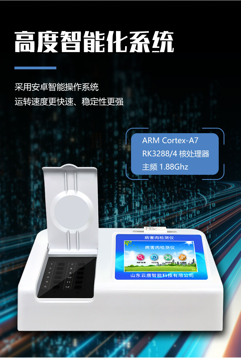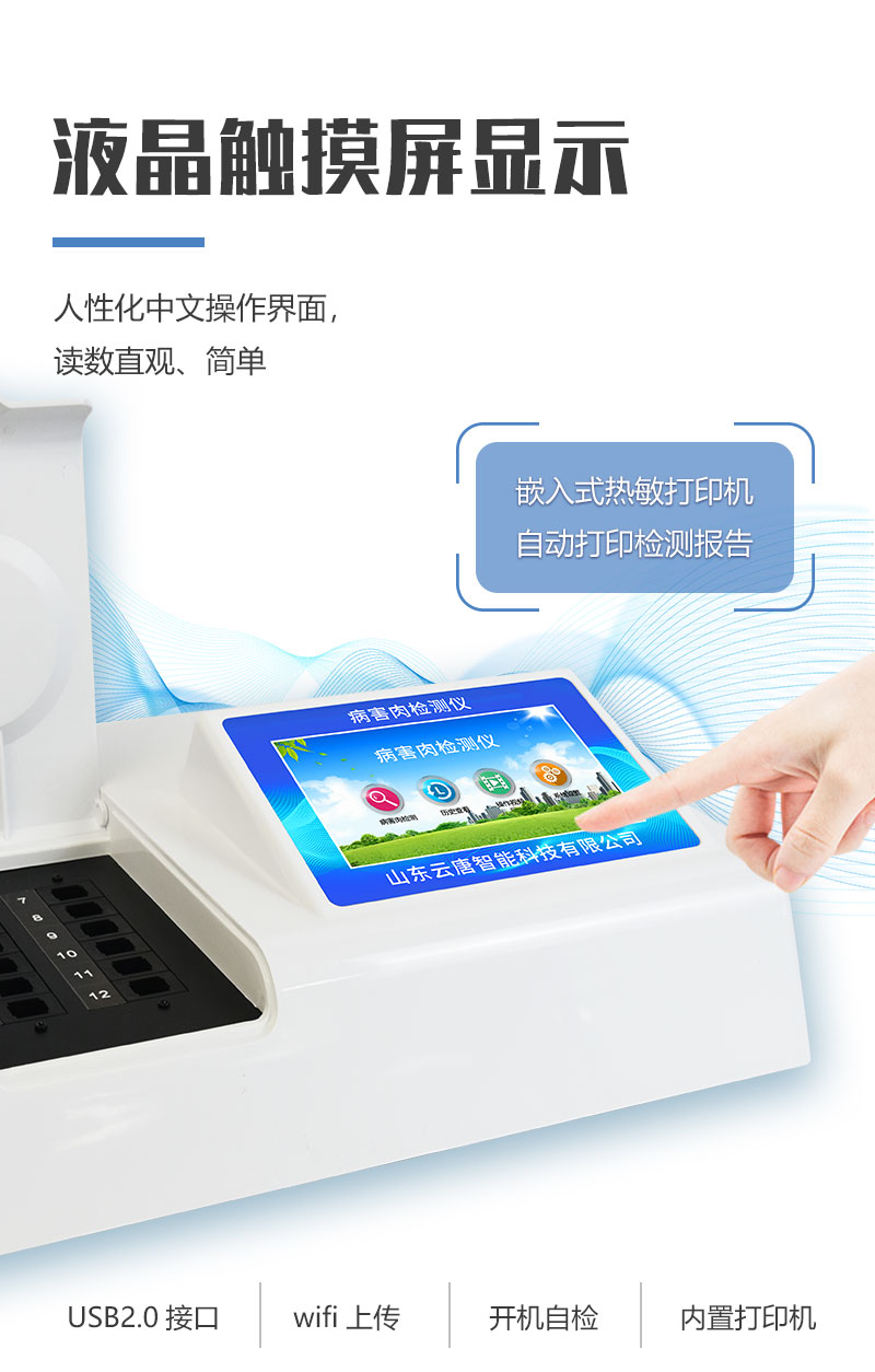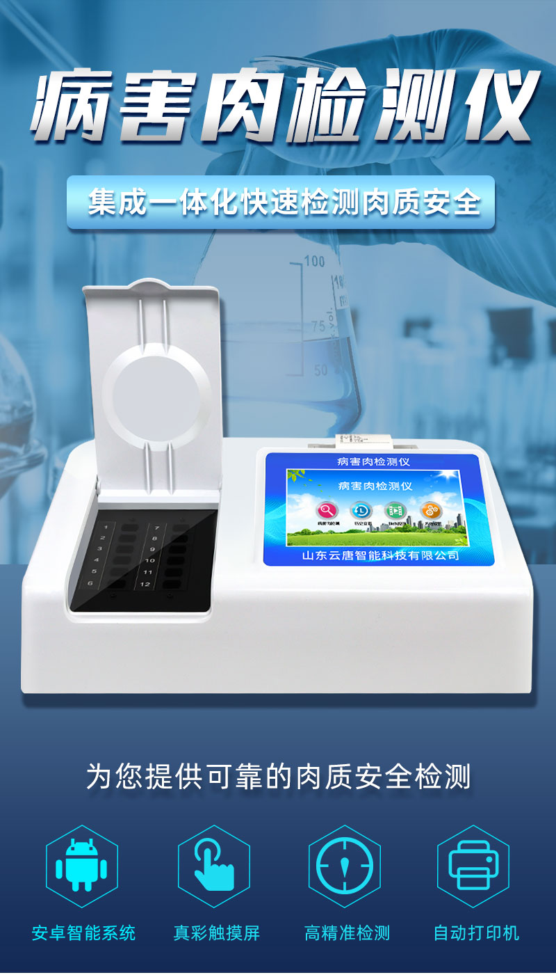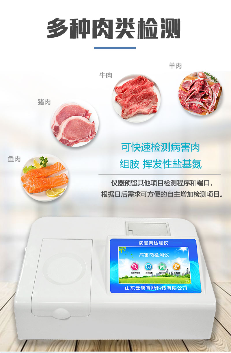 山東云唐智能科技有限公司生產(chǎn)的病害肉檢測(cè)儀為集成化食品安全快速檢測(cè)分析設(shè)備,采用臺(tái)式一體化設(shè)計(jì),可對(duì)豬肉、牛肉、羊肉、魚(yú)類(lèi)等存在的病害肉組胺、揮發(fā)性鹽基氮進(jìn)行快速定量檢測(cè),儀器預(yù)留其他項(xiàng)目檢測(cè)程序和端口,根據(jù)日后需求可進(jìn)行遠(yuǎn)程升級(jí)