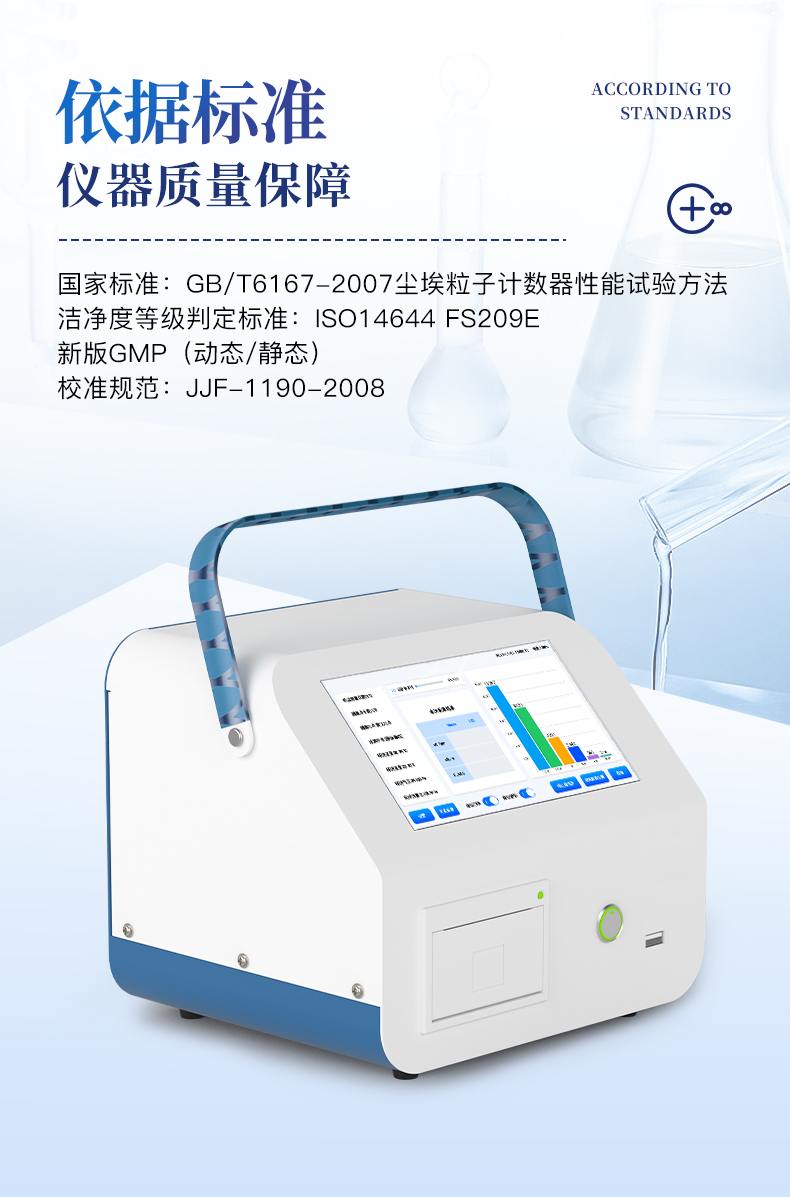 國家標(biāo)準(zhǔn):GB/T6167-2007塵埃粒子計數(shù)器性能試驗方法 潔凈度等級判定標(biāo)準(zhǔn):ISO14644 FS209E ,新版GMP(動態(tài)/靜態(tài)) 校準(zhǔn)規(guī)范:JJF-1190-2008