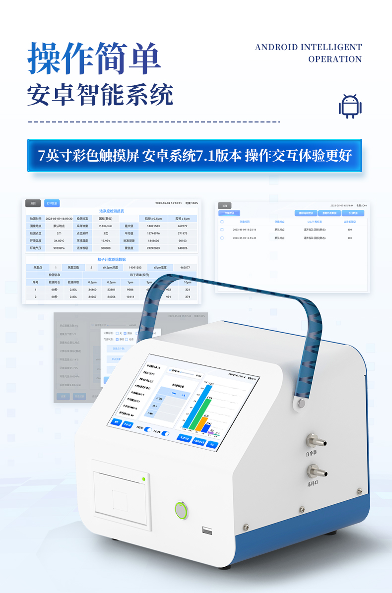 1、安卓系統(tǒng)7.1版本,操作交互體驗更好。 2、內(nèi)置溫濕度傳感器、環(huán)境氣壓傳感器 3、核心部件光散射傳感器明顯消除腔體的雜散光,信噪比大為提高。從而使測量更準(zhǔn)確更可靠。 4、按95%置信度(UCL)計算,計數(shù)結(jié)果可換算成m3和ft3 5、依照凈化級別劃分和規(guī)定,自動判定凈化級別,使用便利。 6、支持wifi、藍(lán)牙傳輸,數(shù)據(jù)可無線上傳;同時支持U盤拷貝數(shù)據(jù),免驅(qū)動插拔。 7、配置監(jiān)管平臺,檢測結(jié)果可直接無線傳至平臺,進行潔凈度長短期分析,輔助管理。 8、內(nèi)置新一代高速熱敏打印機,可選擇所需要打印的粒徑通道,靈活打印結(jié)果。 9、交直流兩用,內(nèi)置充電鋰電池,環(huán)保耐用可支持連續(xù)采樣6小時以上。 10、便捷簡易伸縮式云臺支架,安裝采樣操作更加方便。