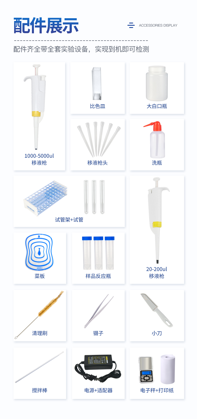 | 乙酰膽堿酯酶和丁酰膽堿酯酶試劑均可以使用,符合國家標(biāo)準(zhǔn)和農(nóng)業(yè)部標(biāo)準(zhǔn)的要求。 | 自動(dòng)判斷樣品是否合格,檢測(cè)結(jié)果更加直觀。 | 儀器具有100多種蔬菜名稱菜單庫,分類管理,并可按需添加或刪除蔬菜名,編輯蔬菜名稱,可直接打印出蔬菜名稱。 | 檢測(cè)通道:12個(gè)檢測(cè)通道,可以同時(shí)測(cè)試多個(gè)樣品,循環(huán)檢測(cè),即放即檢,每個(gè)樣品由程序控制分別獨(dú)立工作,不會(huì)互相干擾。 | 智能操作系統(tǒng),采用更加人性化操作,主控采用多核處理器,主頻1.88Ghz,運(yùn)轉(zhuǎn)速度更快速,穩(wěn)定性更強(qiáng)。 | 顯示方式:7英寸高靈敏真彩觸摸屏顯示,人性化中文操作界面,讀數(shù)直觀、簡(jiǎn)單。 | 打印機(jī)采用串口5v打印,可選擇手動(dòng)打印或者自動(dòng)打印,三分鐘出打印結(jié)果,打印格式為檢測(cè)人姓名、吸光度差值、檢測(cè)時(shí)間、檢測(cè)機(jī)構(gòu)、樣品名稱及結(jié)果判定。 | 光源采用進(jìn)口超高亮發(fā)光二極管,具有低功耗、高精度、穩(wěn)定性強(qiáng)、光源可控可以關(guān)掉不使用的光源,響應(yīng)速度快等優(yōu)點(diǎn)。 | 智能恒流穩(wěn)壓,光強(qiáng)自動(dòng)校準(zhǔn),長(zhǎng)時(shí)間連續(xù)工作光源無溫漂現(xiàn)象。 | 儀器具有GPRS遠(yuǎn)傳功能,可插手機(jī)卡實(shí)現(xiàn)數(shù)據(jù)遠(yuǎn)傳平臺(tái),wifi聯(lián)網(wǎng)功能,可將數(shù)據(jù)快速上傳電腦,進(jìn)行數(shù)據(jù)管理與統(tǒng)計(jì)。 | 采用USB2.0接口設(shè)計(jì),方便數(shù)據(jù)的存貯和移動(dòng),并可隨時(shí)與計(jì)算機(jī)直接相連,并且可用計(jì)算機(jī)控制儀器。實(shí)現(xiàn)數(shù)據(jù)查詢、瀏覽、分析、統(tǒng)計(jì)、打印等。 | 智能化程度高,儀器具有自檢功能:具有開機(jī)自檢和調(diào)零功能,具有自動(dòng)檢測(cè)重復(fù)性功能 | 儀器具有自身保護(hù)功能,可設(shè)置用戶名及密碼,防止非工作人員操作等。 | 采用DC12v直流供電,安全系統(tǒng)更高,并且配備6A鋰電池充電器。 | 儀器具有重新校準(zhǔn)、鎖定、恢復(fù)出廠設(shè)置功能。 |
