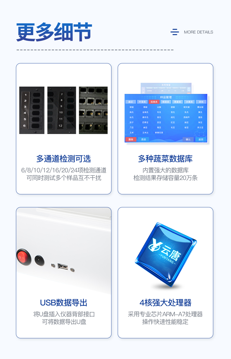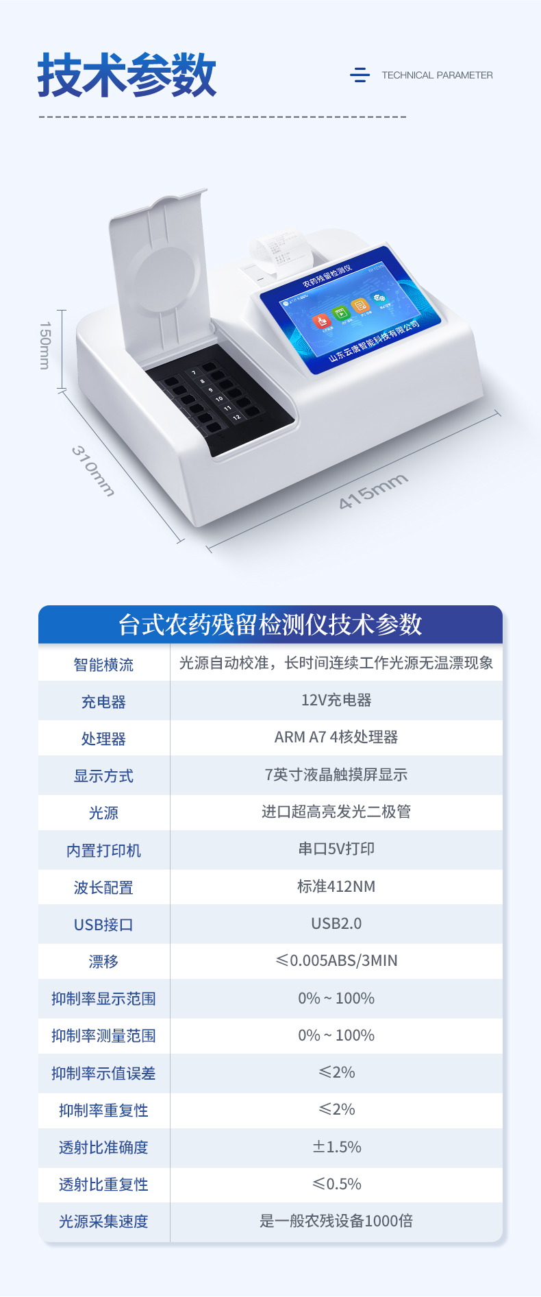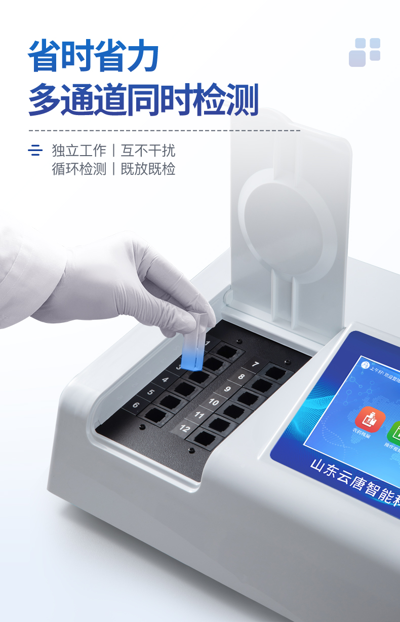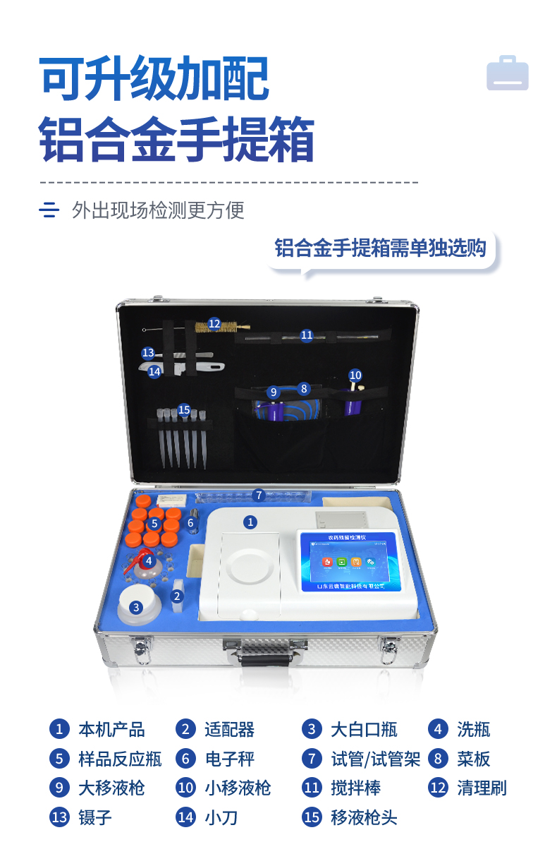| 乙酰膽堿酯酶和丁酰膽堿酯酶試劑均可以使用,符合國(guó)家標(biāo)準(zhǔn)和農(nóng)業(yè)部標(biāo)準(zhǔn)的要求。 | 自動(dòng)判斷樣品是否合格,檢測(cè)結(jié)果更加直觀。 | 儀器具有100多種蔬菜名稱菜單庫(kù),分類管理,并可按需添加或刪除蔬菜名,編輯蔬菜名稱,可直接打印出蔬菜名稱。 | 檢測(cè)通道:12個(gè)檢測(cè)通道,可以同時(shí)測(cè)試多個(gè)樣品,循環(huán)檢測(cè),即放即檢,每個(gè)樣品由程序控制分別獨(dú)立工作,不會(huì)互相干擾。 | 智能操作系統(tǒng),采用更加人性化操作,主控采用多核處理器,主頻1.88Ghz,運(yùn)轉(zhuǎn)速度更快速,穩(wěn)定性更強(qiáng)。 | 顯示方式:7英寸高靈敏真彩觸摸屏顯示,人性化中文操作界面,讀數(shù)直觀、簡(jiǎn)單。 | 打印機(jī)采用串口5v打印,可選擇手動(dòng)打印或者自動(dòng)打印,三分鐘出打印結(jié)果,打印格式為檢測(cè)人姓名、吸光度差值、檢測(cè)時(shí)間、檢測(cè)機(jī)構(gòu)、樣品名稱及結(jié)果判定。 | 光源采用進(jìn)口超高亮發(fā)光二極管,具有低功耗、高精度、穩(wěn)定性強(qiáng)、光源可控可以關(guān)掉不使用的光源,響應(yīng)速度快等優(yōu)點(diǎn)。 | 智能恒流穩(wěn)壓,光強(qiáng)自動(dòng)校準(zhǔn),長(zhǎng)時(shí)間連續(xù)工作光源無(wú)溫漂現(xiàn)象。 | 儀器具有GPRS遠(yuǎn)傳功能,可插手機(jī)卡實(shí)現(xiàn)數(shù)據(jù)遠(yuǎn)傳平臺(tái),wifi聯(lián)網(wǎng)功能,可將數(shù)據(jù)快速上傳電腦,進(jìn)行數(shù)據(jù)管理與統(tǒng)計(jì)。 | 采用USB2.0接口設(shè)計(jì),方便數(shù)據(jù)的存貯和移動(dòng),并可隨時(shí)與計(jì)算機(jī)直接相連,并且可用計(jì)算機(jī)控制儀器。實(shí)現(xiàn)數(shù)據(jù)查詢、瀏覽、分析、統(tǒng)計(jì)、打印等。 | 智能化程度高,儀器具有自檢功能:具有開機(jī)自檢和調(diào)零功能,具有自動(dòng)檢測(cè)重復(fù)性功能 | 儀器具有自身保護(hù)功能,可設(shè)置用戶名及密碼,防止非工作人員操作等。 | 采用DC12v直流供電,安全系統(tǒng)更高,并且配備6A鋰電池充電器。 | 儀器具有重新校準(zhǔn)、鎖定、恢復(fù)出廠設(shè)置功能。 |
