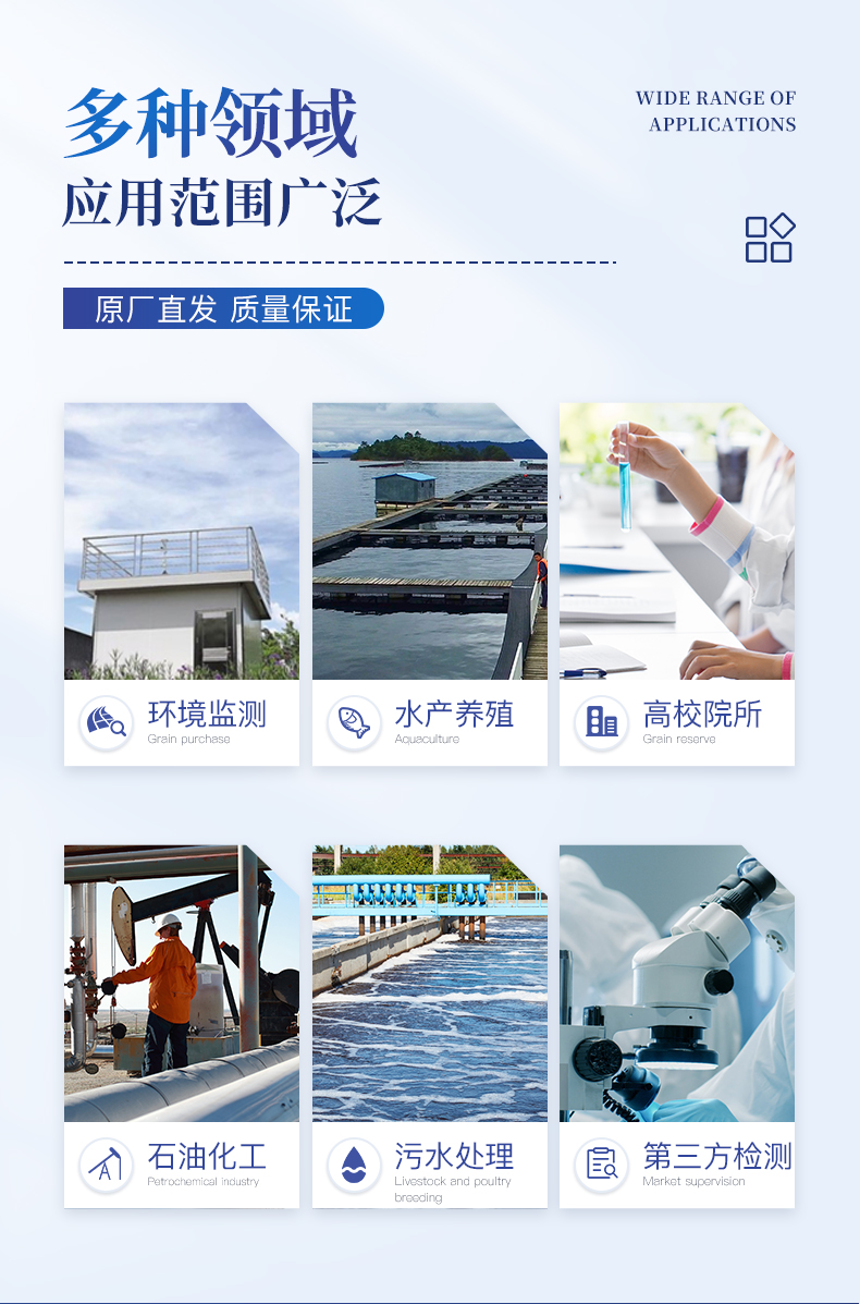 適用于生活污水、工業(yè)廢水、地下水、地表水中多種水質(zhì)污染物的檢測;運用于水質(zhì)檢測實驗室、市政、污水處理廠、環(huán)境監(jiān)測站及教育科研高校、電廠、疾控中心、造紙電鍍、水產(chǎn)養(yǎng)殖、生物制藥、石化、煤炭、冶金、紡織、食品等行業(yè)的水質(zhì)分析。