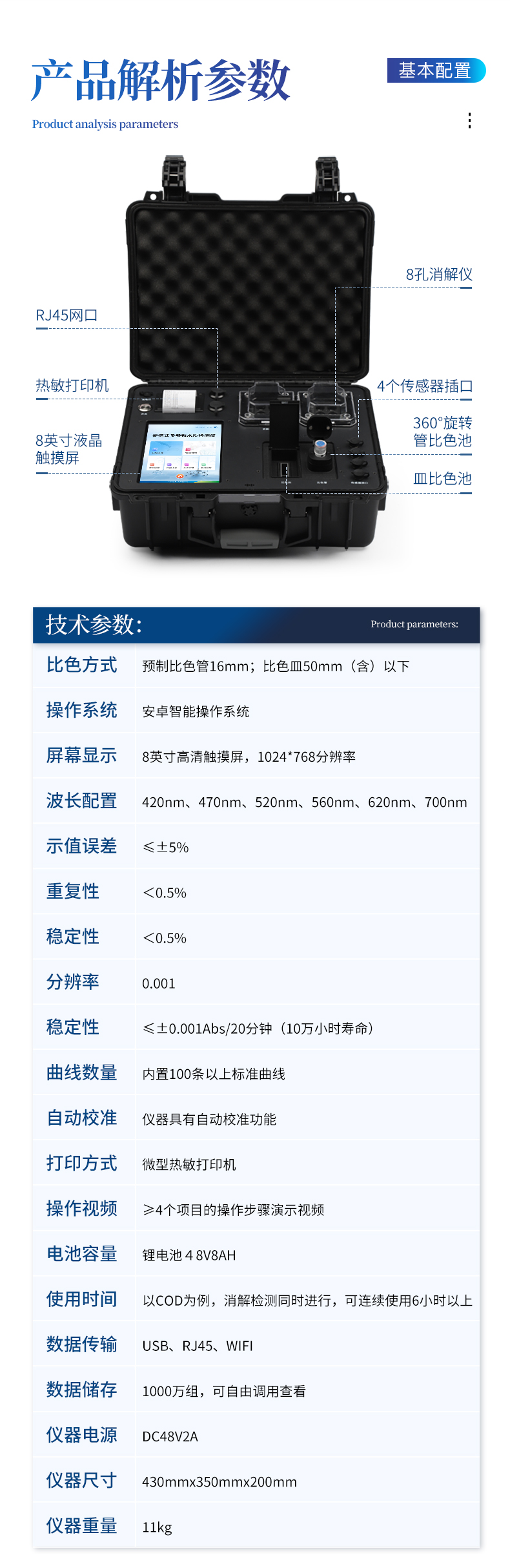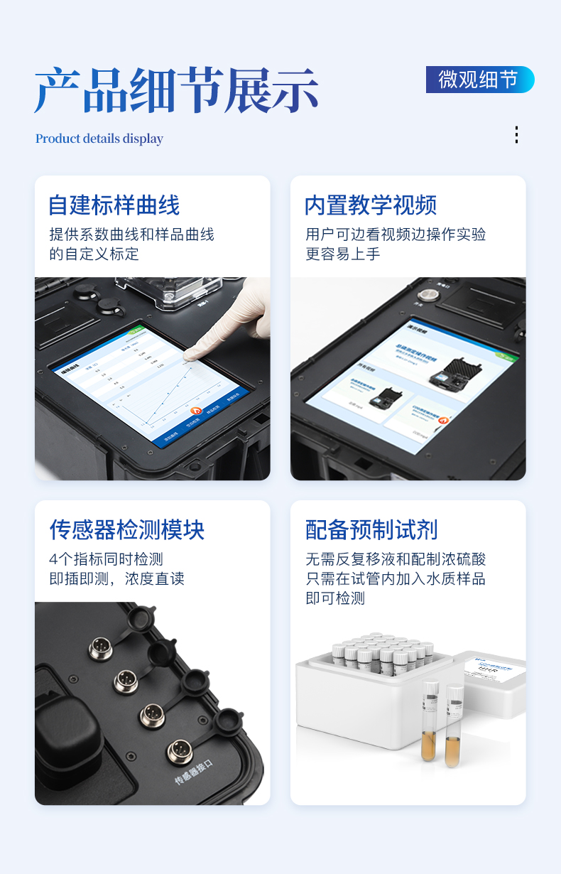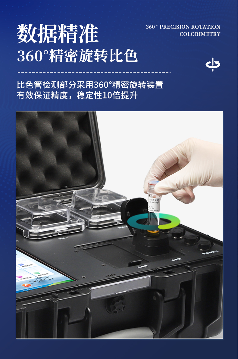 簡介:便攜式總磷檢測儀簡介:YT-BTP型便攜式總磷檢測儀采用高強度PVC工程塑料手提箱設(shè)計,消解檢測一體式設(shè)計,其中消解模塊具備雙溫區(qū)功能,檢測部分同時具備360°旋轉(zhuǎn)比色試管檢測和比色皿檢測,安卓智能操作系統(tǒng),8英寸高清液晶觸摸屏,光纖檢測技術(shù),進口光源,內(nèi)置大容量鋰電池,便攜多參數(shù)水質(zhì)檢測儀具有性能穩(wěn)定、測量準(zhǔn)確