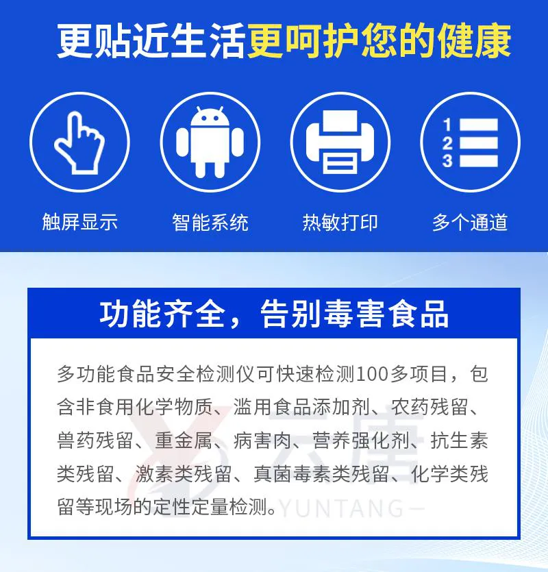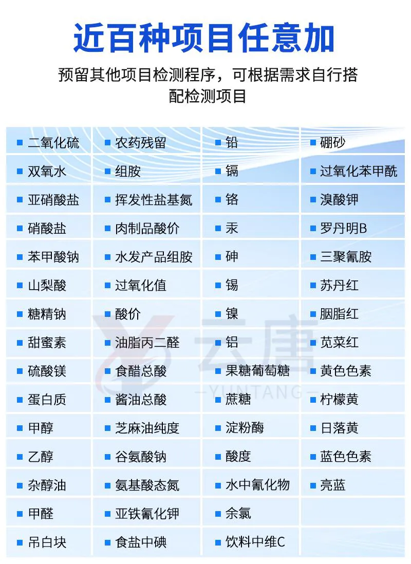 檢測項目:可快速定量檢測各類食品中的甲醛的含量,儀器預留其他項目檢測程序和端口,根據日后需求可方便的自主增加檢測項目。日后可升級為檢測,水產品,肉制品,面制品的綜合類型儀器。