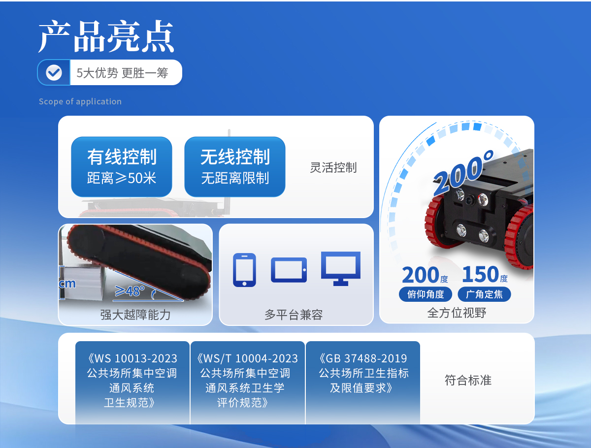 | 尺寸規(guī)格:310mm * 160mm * 100mm; | 適用范圍:適用于*小尺寸為100×160毫米的矩形鐵皮風管; | 采樣方法:支持刮拭法和擦拭法兩種采樣方法,采樣時間可調; | 取樣面積:50平方厘米; | 采樣誤差:<5%; | 采樣偏差:<3%; | 前置攝像頭:俯仰角度200度,300萬像素CMOS感光元件,150度橫向視角廣角定焦鏡頭; | 后置攝像頭:300萬像素CMOS感光元件,150度橫向視角廣角定焦鏡頭; | 前置燈光:5W*4 LED正白光; | 后置燈光:5W*2 LED正白光; | 越障礙高度:≥7cm; | 爬坡角度:≥48度; | 四方向平移速度:0-12米/分鐘; | 轉彎半徑:原地旋轉; | 行走距離:有線控制≥50米; | 控制方式:無線或RJ45有線; | 控制終端:支持安卓、鴻蒙系統(tǒng); | 電池類型:4000mAh專用動力鋰電池; | 充電時間:≤4小時; | 連續(xù)運行時間:5-6小時; | 供電功率:全峰值運行功耗<70W; |