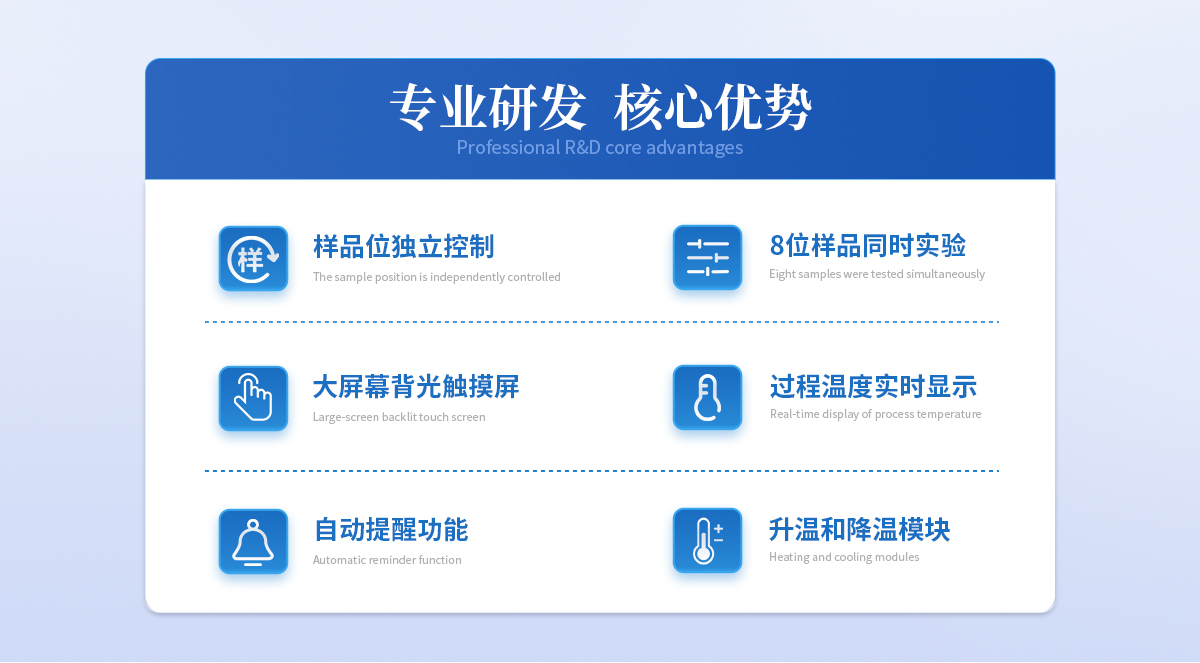 | ◆ 全樣品位:28位, | ◆ 可同時(shí)滿足制膠過程和冰水浴操作。制膠和冰水浴可在屏上獨(dú)立操控,互不影響。 | ◆ 制膠控制,通過無級(jí)控溫旋鈕控制加熱功率,安全制膠。 | ◆ 水位自動(dòng)檢測功能:自動(dòng)檢測水位,缺水自動(dòng)停止。 | ◆ 自動(dòng)進(jìn)排水:自動(dòng)進(jìn)排水。 | ◆ 控溫精度:±0.1℃ | ◆ 沸點(diǎn)自動(dòng)檢測 不同地區(qū)不同大氣壓下自動(dòng)檢測當(dāng)下環(huán)境的沸點(diǎn),提醒加樣。 | ◆ 提醒功能: 沸水浴停止自動(dòng)提醒 靜置結(jié)束自動(dòng)提醒 冰水浴冷卻結(jié)束自動(dòng)提醒 冰水浴溫度過高加冰提醒 沸水到溫提醒制膠開始。 | ◆ 大屏幕背光觸摸屏,方便直觀操作。 |