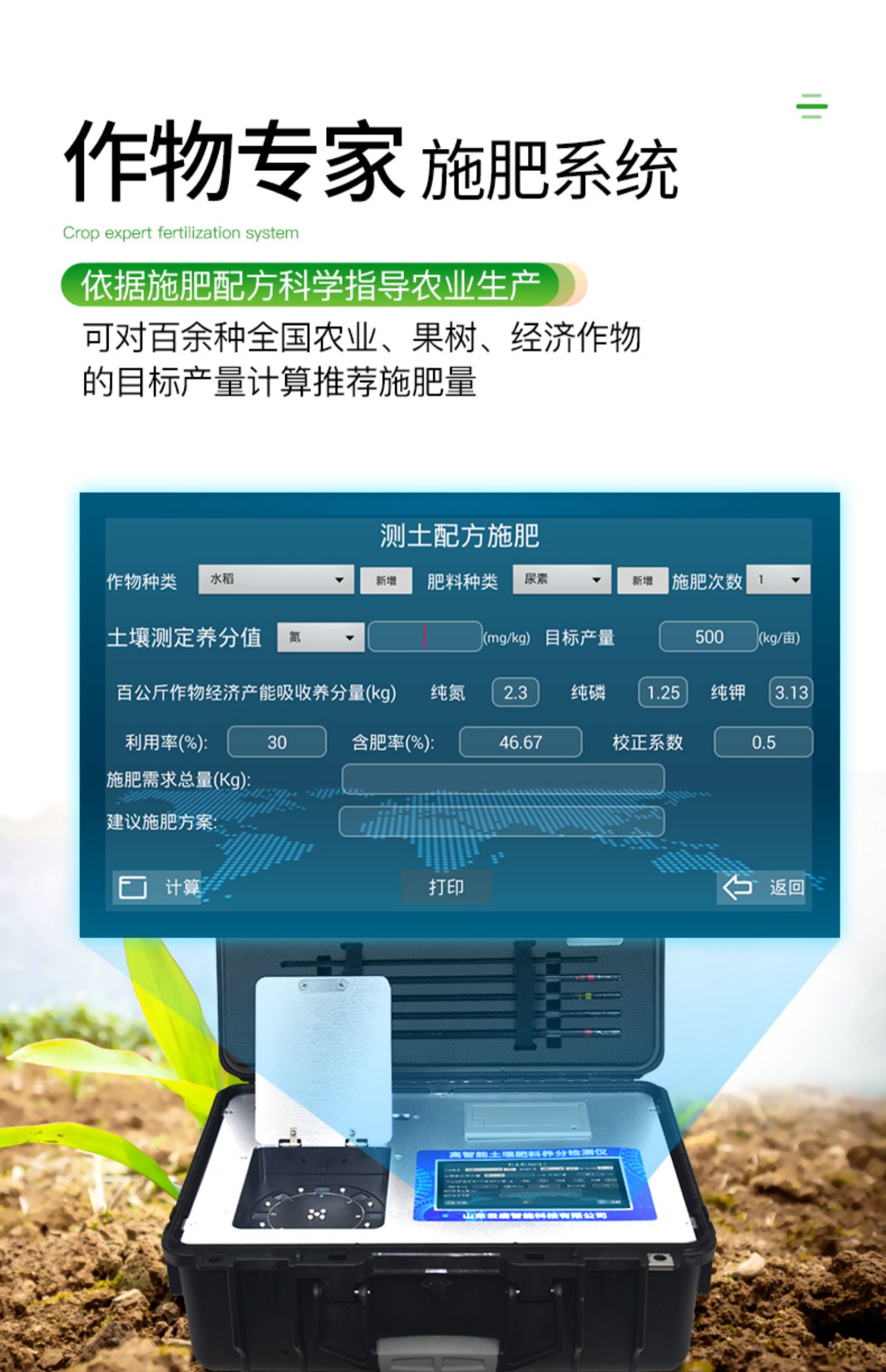 ★配套專家施肥系統(tǒng)數(shù)據(jù),可對(duì)百余種農(nóng)業(yè)、果樹、經(jīng)濟(jì)作物目標(biāo)產(chǎn)量科學(xué)計(jì)算推薦施肥量。