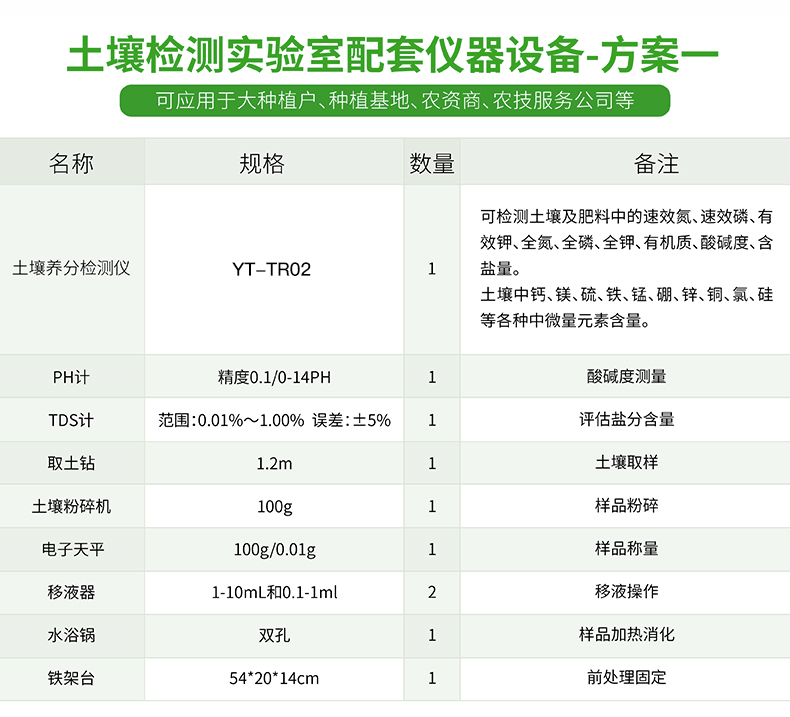 1、土壤養(yǎng)分:●銨態(tài)氮、硝態(tài)氮、速效磷、速效鉀、有機(jī)質(zhì)、全氮、pH值、水份、堿解氮等九項(xiàng); ● 中微量元素:鈣、鎂、硫、鐵、錳、硼、鋅、銅、氯、硅、鉬等。