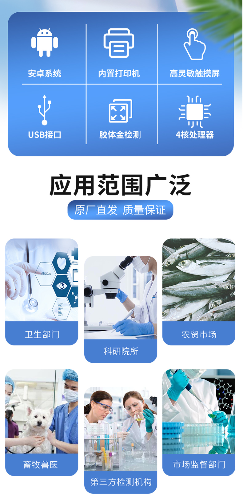 該動物疫病檢測儀器適用于豬、雞、鴨、羊、牛、牛奶等畜禽產(chǎn)品中動物疫病、獸藥殘留、有毒有害物質(zhì)和抗生素殘留的檢測可廣泛應(yīng)用于食藥監(jiān)局、衛(wèi)生部門、高教院校、科研院所、農(nóng)業(yè)部門、畜牧獸醫(yī)、養(yǎng)殖場、屠宰場、食品肉產(chǎn)品深加工企業(yè)、檢驗檢疫部門等單位使用。