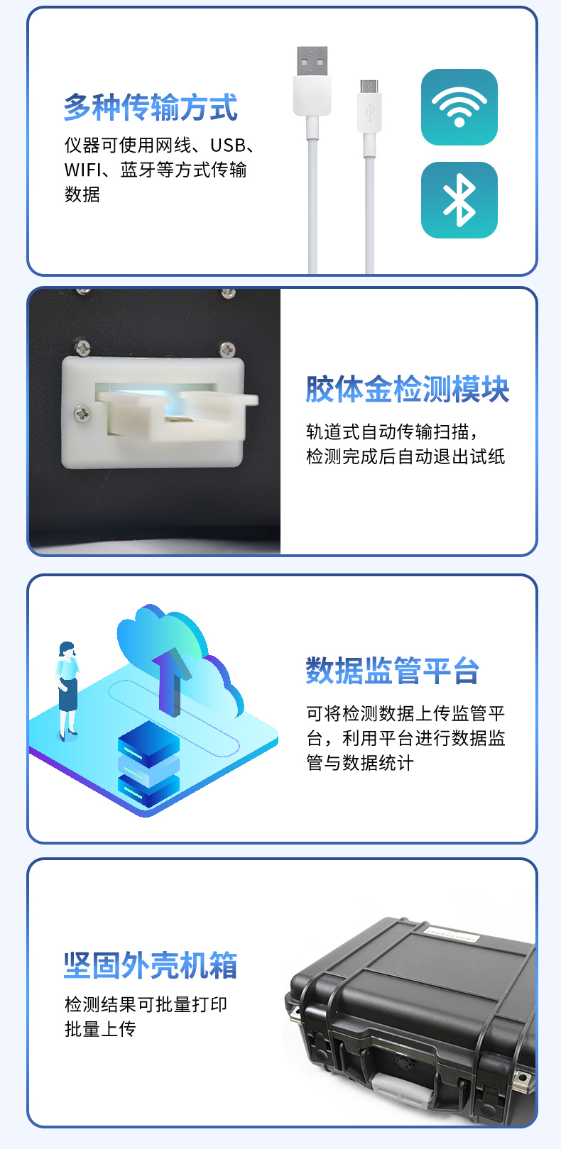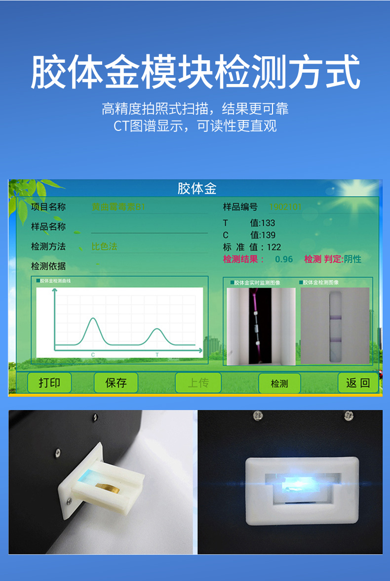 膠體金模塊檢測方式:軌道式自動傳輸掃描,檢測完成后自動退出試紙。