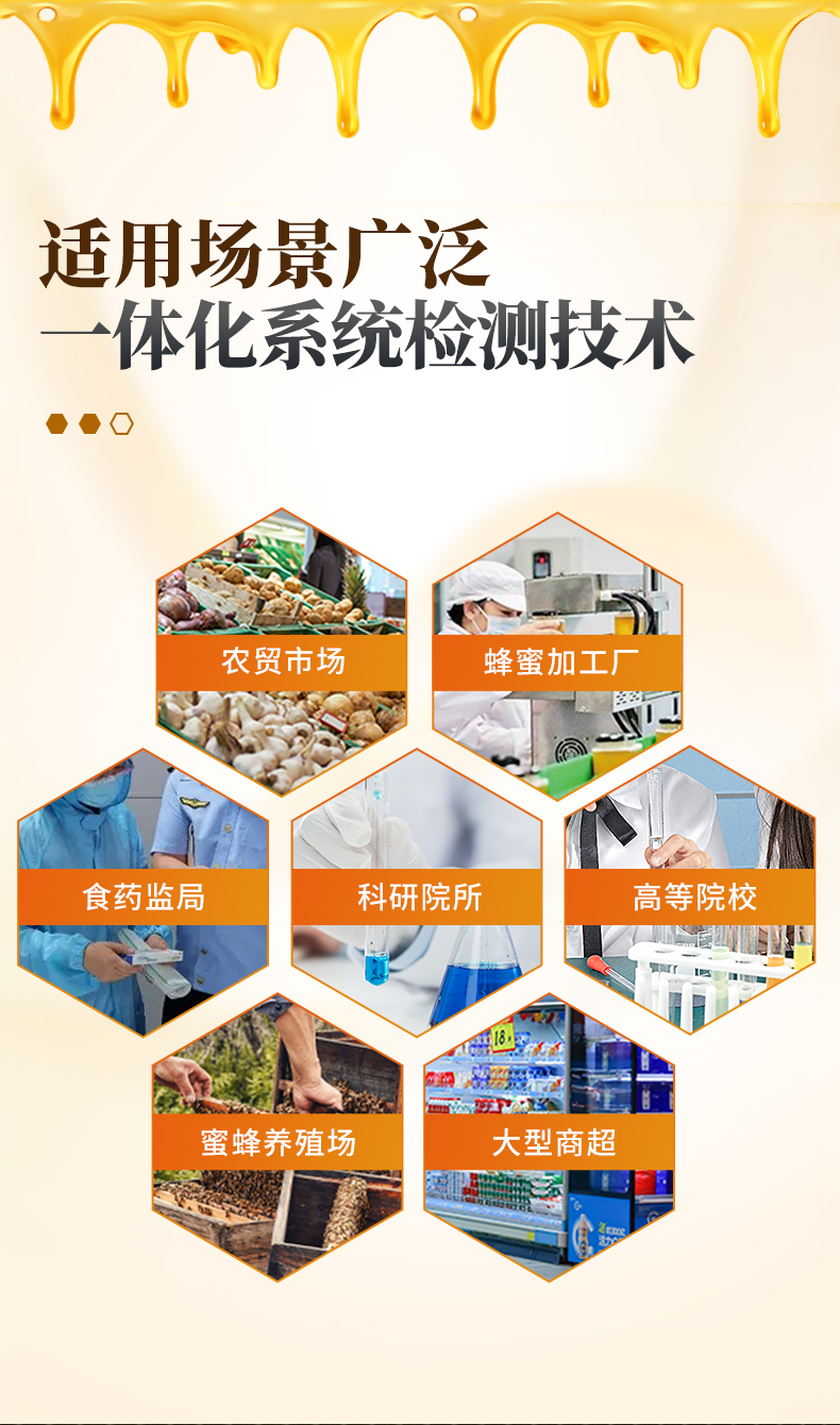 該蜂蜜檢測儀為集成化食品安全快速檢測分析設(shè)備,目前已于食藥監(jiān)局、市場監(jiān)督部門、高教院校、科研院所、農(nóng)業(yè)部門、蜜蜂養(yǎng)殖場、蜂蜜加工廠等單位廣泛使用。