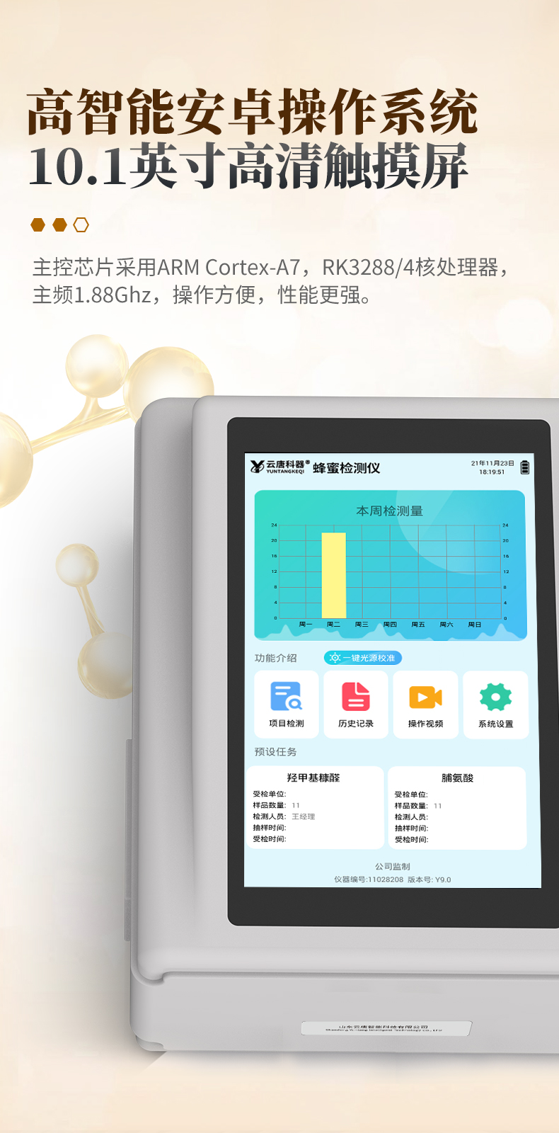 3、顯示屏幕:儀器采用10.1英寸豎向液晶觸摸屏顯,搭配運行安卓智能操作系統(tǒng),主控芯片采用ARM Cortex-A7,RK3288/4核處理器,主頻1.88Ghz,操作方便,性能更強。