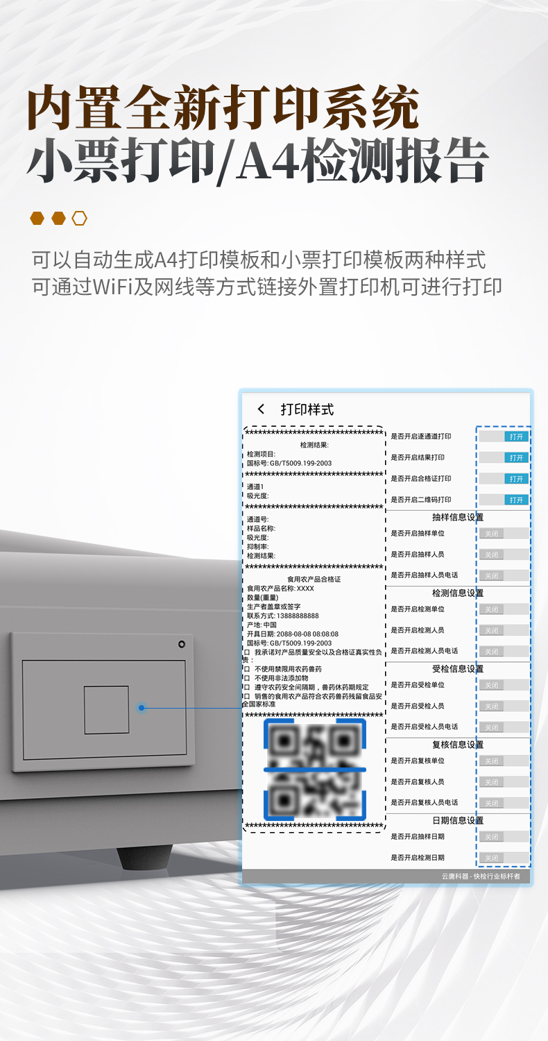 9.7.1、全新打印系統(tǒng):內(nèi)置全新打印機,新創(chuàng)自定義打印方式,可按需靈活勾選控制:產(chǎn)品合格證(國家農(nóng)業(yè)部標(biāo)準(zhǔn)要求),二維碼,抽樣信息、檢測信息,受檢信息、復(fù)核信息、抽樣日期、檢測日期等信息的打印。