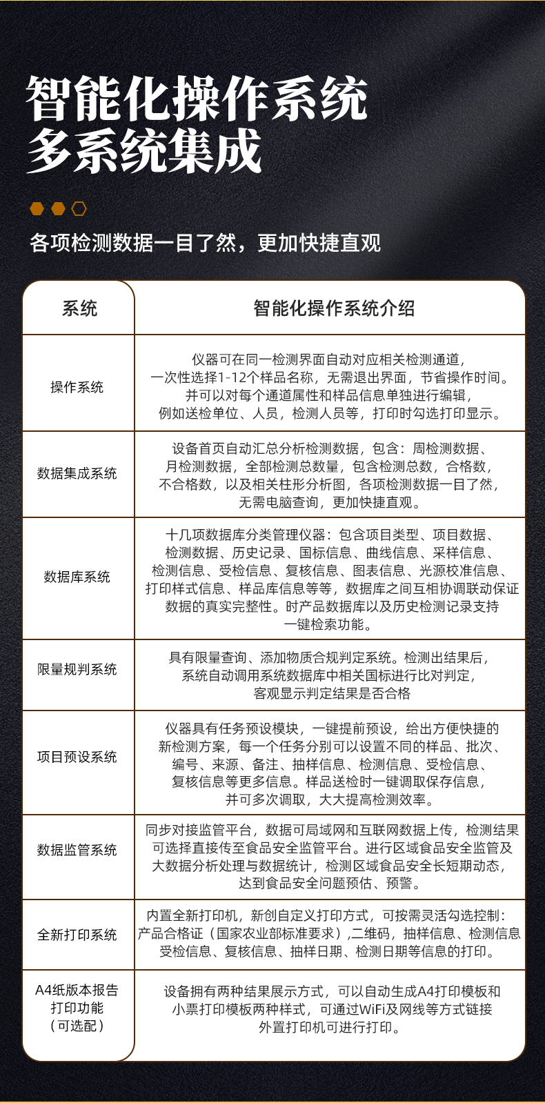 1、儀器采用手提一體化系統(tǒng)檢測技術(shù),將分光光度模塊、膠體金檢測模塊、新型農(nóng)殘檢測模塊、數(shù)字化管理模塊、無線通訊模塊高度集成于一體,支持檢測200種食品安全檢測項目,同時預(yù)留升級檢測方法。