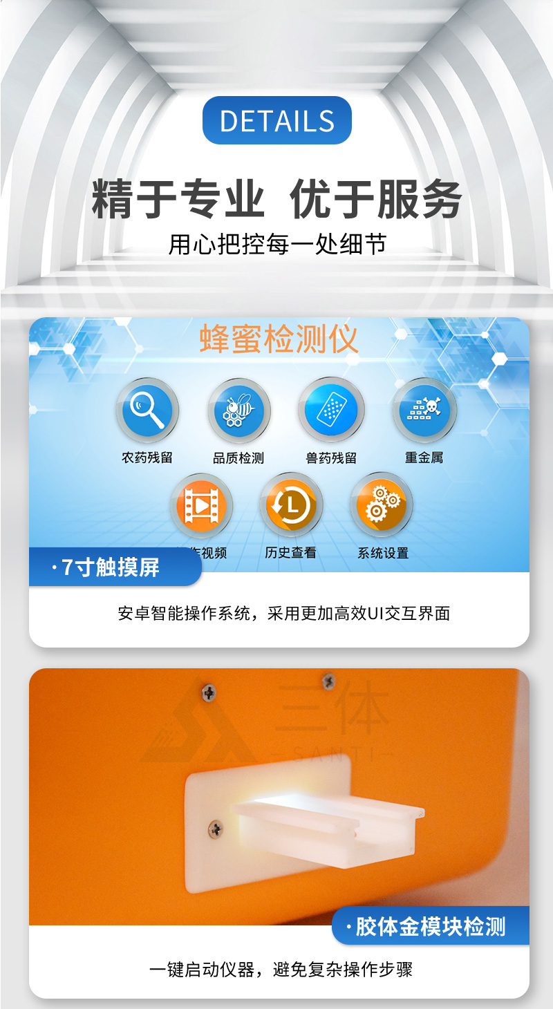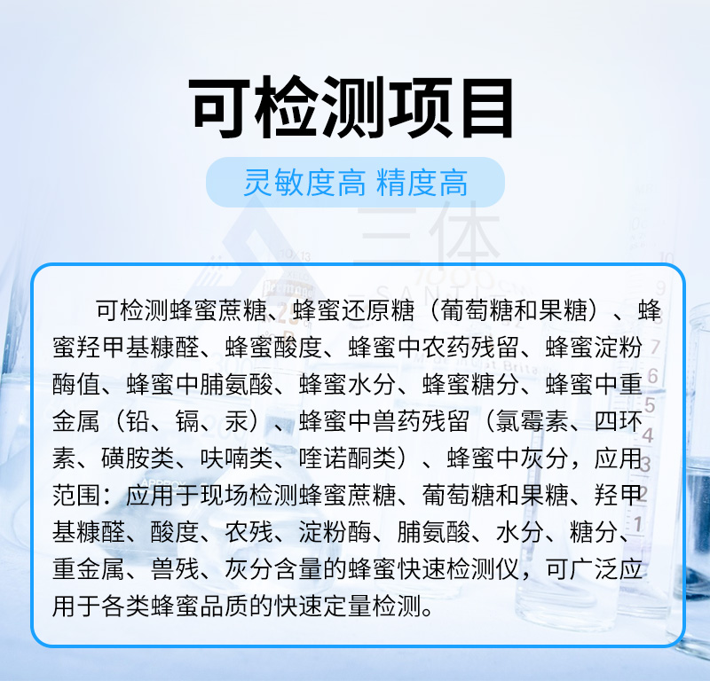檢測項目:蜂蜜蔗糖、蜂蜜還原糖(葡萄糖和果糖)、蜂蜜羥甲基糠醛、蜂蜜酸度、蜂蜜中農藥殘留、蜂蜜淀粉酶值、蜂蜜中脯氨酸、蜂蜜水分、蜂蜜糖分、蜂蜜中重金屬(鉛、鎘、汞)、蜂蜜中抗生素(氯霉素、四環(huán)素、磺胺類、呋喃類、喹諾酮類)、蜂蜜中灰分,應用范圍:應用于現場檢測蜂蜜蔗糖、葡萄糖和果糖、羥甲基糠醛、酸度、農殘、淀粉酶、脯氨酸、水分、糖分、重金屬、抗生素、灰分含量的蜂蜜快速檢測儀,可廣泛應用于各類蜂蜜品質的快速定量檢測。