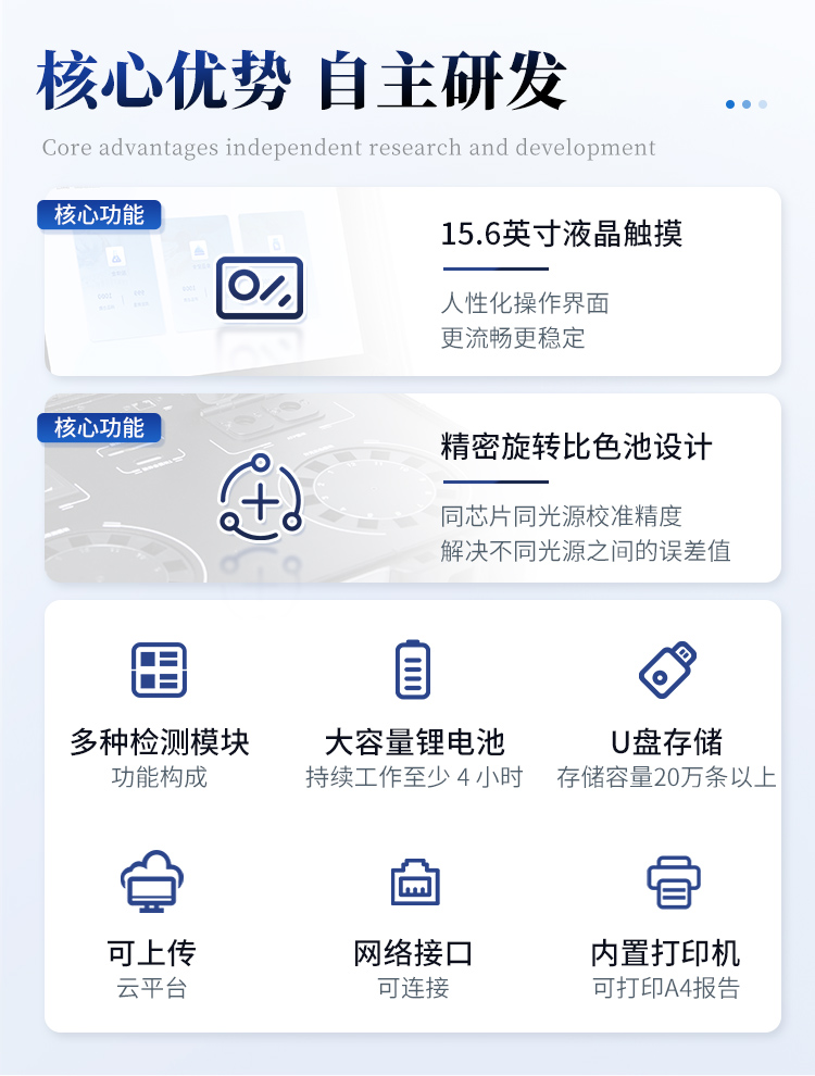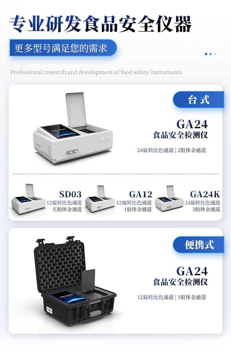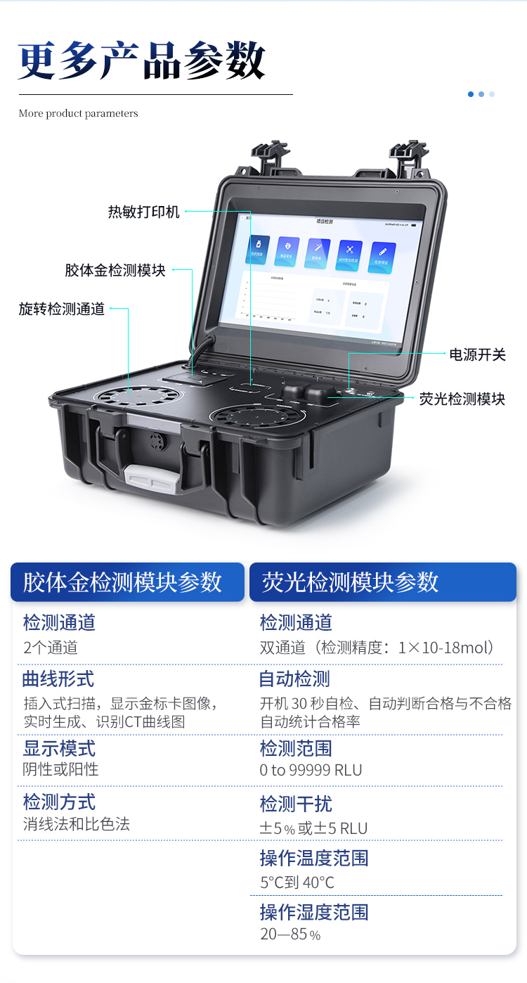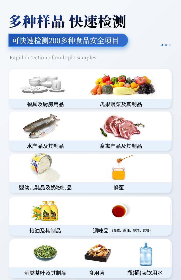 | 1. 功能構(gòu)成:主要包括分光光度模塊、新型農(nóng)殘檢測模塊、膠體金檢測模塊、熒光檢測模塊、數(shù)字化管理模塊等,所有模塊集成一體,可快速檢測200多種食品安全項目,如獸藥殘留、農(nóng)藥殘留、非法添加劑、細(xì)菌數(shù)值等指標(biāo)。 | 2. 檢測樣品種類:餐具及廚房用品、瓜果蔬菜及其制品、水產(chǎn)品及其制品、畜禽產(chǎn)品及其制品、嬰幼兒乳品及奶粉制品、蜂蜜、糧油及其制品、調(diào)味品(食醋、醬油、味精、鹽等)、酒類茶葉及其制品、食用菌、飲料、蛋類藥物殘留(雞蛋,鴨蛋等)、米豆面制品、糖果糕點類(小食品)、薯類及膨化食品、瓶(桶)裝飲用水、添加食用色素的食品、使用添加劑的食品、含有有毒有害物質(zhì)的相關(guān)食品。 | 3、顯示屏幕:儀器采用15.6英寸液晶觸摸屏顯,搭配運行安卓智能操作系統(tǒng),主控芯片采用ARM Cortex-A7,RK3288/4核處理器,主頻1.88Ghz,操作方便,性能更強。 | 4、供電模式:儀器交直流兩用,直流12V供電,可連接車載電源,配18ah大容量充電鋰電池,電量可實時顯示,無外部電源條件下可持續(xù)工作至少 4 小時。 | 5、檢測通道:≥24通道;采用精密旋轉(zhuǎn)比色池設(shè)計,使用同芯片同光源校準(zhǔn)精度,解決不同光源之間的誤差值,更加準(zhǔn)確**,采用高精度進(jìn)口四波長冷光源,每個通道均配置 410、520、590、630nm 波長光源,標(biāo)配**的光路切換裝置,**光路切換功能可實現(xiàn)64波長,并且所有檢測項目可實現(xiàn)所有通道同時檢測. | 6、通訊接口:配備無線通信模塊、4G(APN)通訊模塊、藍(lán)牙傳輸,同時具有雙USB接口以及RJ45網(wǎng)線接口,可以多方式實現(xiàn)數(shù)據(jù)保存及數(shù)據(jù)傳輸。 | 7、存儲方式:支持U盤存儲,兩個標(biāo)準(zhǔn)USB接口,免驅(qū)動安裝。檢測結(jié)果存儲容量20萬條以上,可生成Excel表格進(jìn)行拷貝,并具有登錄保護(hù)功能。 | 8、操作系統(tǒng):儀器可在同一檢測界面自動對應(yīng)相關(guān)檢測通道,一次性選擇不少于11個樣品名稱,無需退出界面,節(jié)省操作時間。并可以對每個通道屬性和樣品信息單獨進(jìn)行編輯,例如送檢單位、人員,檢測人員等,打印時勾選打印顯示。 | 9、數(shù)據(jù)集成系統(tǒng):設(shè)備首頁自動匯總分析檢測數(shù)據(jù),包含:周檢測數(shù)據(jù)、月檢測數(shù)據(jù),全部檢測總數(shù)量,包含檢測總數(shù),合格數(shù),不合格數(shù),以及相關(guān)柱形分析圖,各項檢測數(shù)據(jù)一目了然,無需電腦查詢,更加快捷直觀。 | 10、數(shù)據(jù)庫系統(tǒng):十幾項數(shù)據(jù)庫分類管理儀器:包含項目類型、項目數(shù)據(jù)、檢測數(shù)據(jù)、歷史記錄、國標(biāo)信息、曲線信息、采樣信息、檢測信息、受檢信息、復(fù)核信息、圖表信息、光源校準(zhǔn)信息、打印樣式信息、樣品庫信息等等,數(shù)據(jù)庫之間互相協(xié)調(diào)聯(lián)動保證數(shù)據(jù)的真實完整性。同時產(chǎn)品數(shù)據(jù)庫以及歷史檢測記錄支持一鍵檢索功能。 | 11、限量規(guī)判系統(tǒng):具有限量查詢、添加物質(zhì)合規(guī)判定系統(tǒng)。檢測出結(jié)果后,系統(tǒng)自動調(diào)用系統(tǒng)數(shù)據(jù)庫中相關(guān)國標(biāo)進(jìn)行比對判定,客觀顯示判定結(jié)果是否合格。 | 12、項目預(yù)設(shè)系統(tǒng):儀器具有任務(wù)預(yù)設(shè)模塊,一鍵提前預(yù)設(shè),給出方便快捷的新檢測方案,每一個任務(wù)分別可以設(shè)置不同的樣品、批次、編號、來源、備注、抽樣信息、檢測信息、受檢信息、復(fù)核信息等更多信息。樣品送檢時一鍵調(diào)取保存信息,并可多次調(diào)取,適用于大批量檢測業(yè)務(wù),可以大大提高檢測效率。 | 13、數(shù)據(jù)監(jiān)管系統(tǒng):同步對接監(jiān)管平臺,數(shù)據(jù)可局域網(wǎng)和互聯(lián)網(wǎng)數(shù)據(jù)上傳,檢測結(jié)果可直接傳至食品安全監(jiān)管平臺。進(jìn)行區(qū)域食品安全監(jiān)管及大數(shù)據(jù)分析處理與數(shù)據(jù)統(tǒng)計,監(jiān)測區(qū)域食品安全長短期動態(tài)及問題預(yù)估、預(yù)警。 | 14.1、全新打印系統(tǒng):內(nèi)置全新打印機,新創(chuàng)自定義打印方式,可按需靈活勾選控制:產(chǎn)品合格證(國家農(nóng)業(yè)部標(biāo)準(zhǔn)要求),二維碼,抽樣信息、檢測信息,受檢信息、復(fù)核信息、抽樣日期、檢測日期等信息的打印。 | 14.2、A4紙版本報告打印功能:設(shè)備擁有兩種結(jié)果展示方式,可以自動生成A4打印模板和小票打印模板兩種樣式,可通過WiFi及網(wǎng)線等方式連接外置打印機可進(jìn)行打印。 | 15、膠體金檢測模塊:采用單通道CMOS成像處理技術(shù)及膠體金免疫層析技術(shù),可讀取膠體金卡數(shù)據(jù),自動采集、處理分析,將檢測結(jié)果顯示,并可根據(jù)參考限值自動判斷檢測結(jié)果,可檢測常見的獸藥殘留、生物毒素、抗生素、違禁添加物等。 | 15.1、可即時檢測單聯(lián)卡及三聯(lián)卡; | 15.2、檢測通道:2個通道; | 15.3、檢測方式:消線法和比色法; | 15.4、顯示模式:陰性或陽性; | 15.5、曲線形式:插入式掃描方式,顯示金標(biāo)卡圖像,實時生成、識別CT曲線圖,無需手動調(diào)整。兼容市場上其他金標(biāo)卡,使用耗材不受限制。 | 16、熒光檢測模塊:快速檢測水質(zhì)