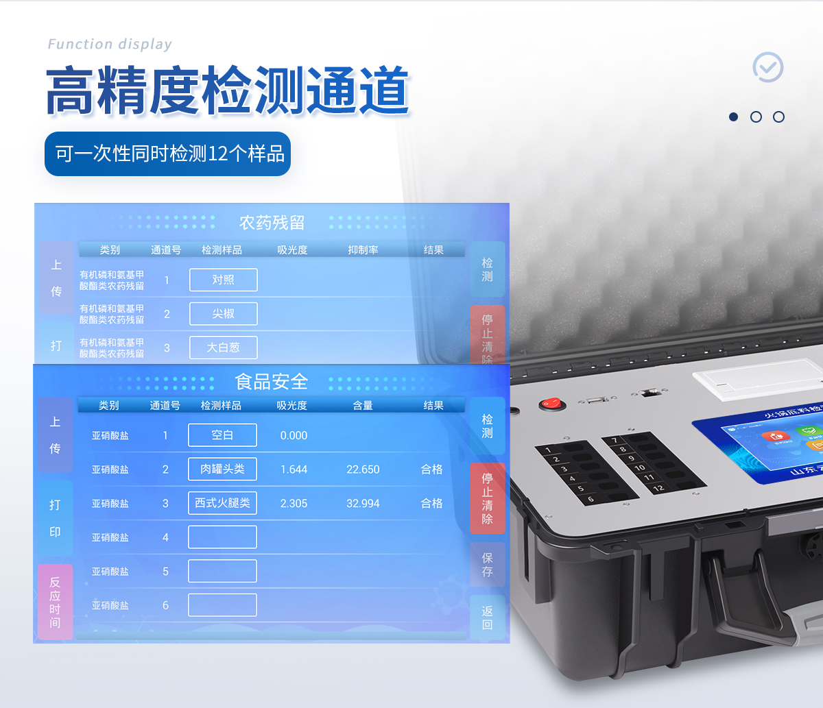 5、一體化便攜式快檢設(shè)備,滿足現(xiàn)場(chǎng)及流動(dòng)檢測(cè)使用需求,能夠在同一軟件下實(shí)現(xiàn)所有檢測(cè)項(xiàng)目的檢測(cè),并可通過同一窗口直觀顯示檢測(cè)結(jié)果。