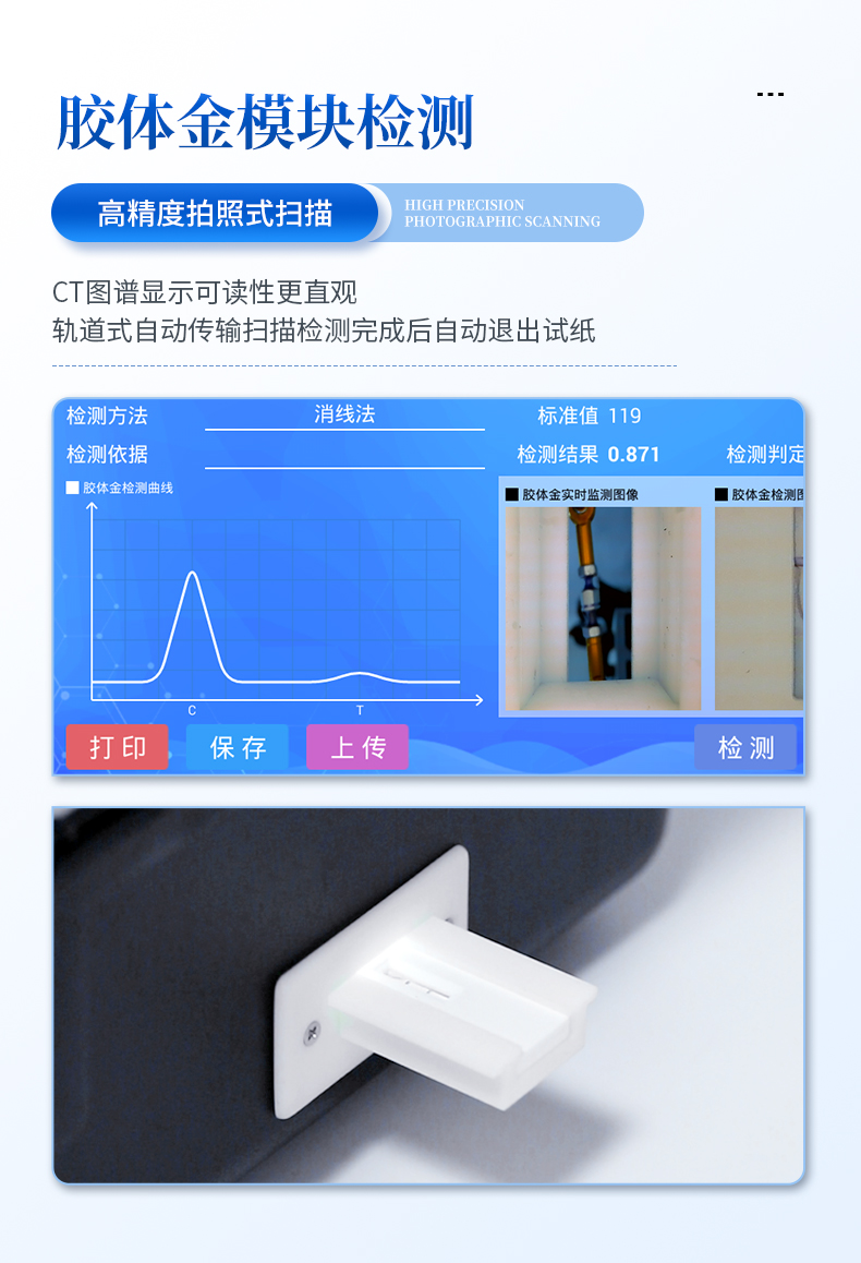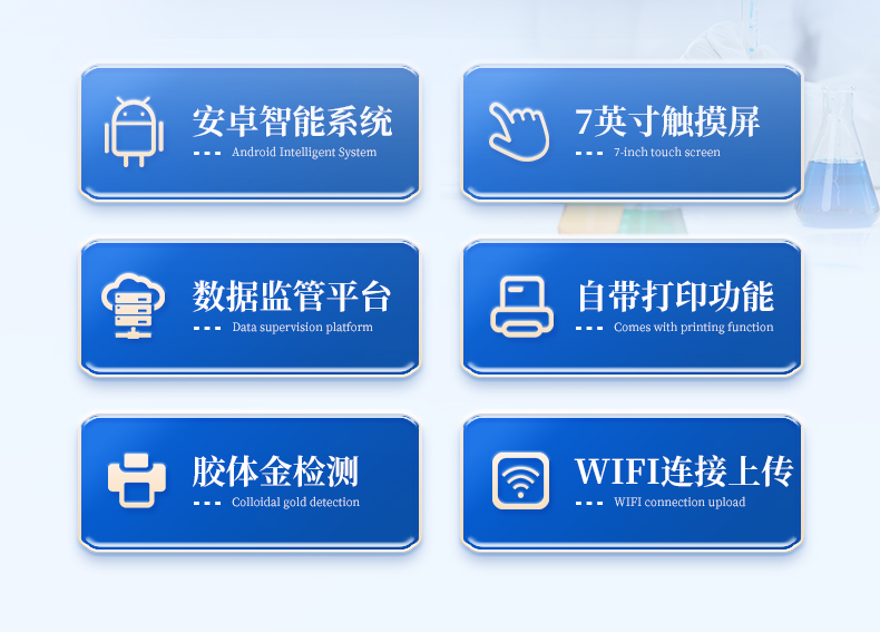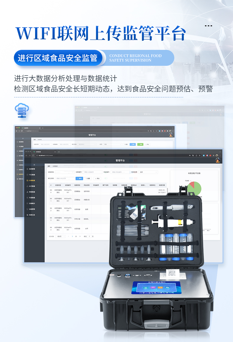 | 機(jī)箱采用工業(yè)級ABS工程塑料箱,方便攜帶,穩(wěn)固耐用,便于流動測試。 | 安卓智能操作系統(tǒng),采用更加**和人性化操作,儀器具有網(wǎng)線連接、wifi聯(lián)網(wǎng)上傳、4G無線遠(yuǎn)傳功能,快速上傳數(shù)據(jù)。 | 智能化程度高,儀器具有自檢功能:具有開機(jī)自檢和調(diào)零功能,具有自動檢測重復(fù)性功能。 | 新一代高速熱敏打印機(jī),檢測完成可自動打印檢測報告和二維碼。 | 儀器帶有監(jiān)管平臺,數(shù)據(jù)可局域網(wǎng)和互聯(lián)網(wǎng)數(shù)據(jù)上傳,檢測結(jié)果直接傳至食品安全監(jiān)管平臺。進(jìn)行區(qū)域食品安全監(jiān)管及大數(shù)據(jù)分析處理與數(shù)據(jù)統(tǒng)計,檢測區(qū)域食品安全長短期動態(tài),達(dá)到食品安全問題預(yù)估、預(yù)警 | 一體化主機(jī),包含食品安全檢測模塊、多通道農(nóng)藥殘留檢測模塊、膠體金免疫層析檢測模塊。 | 一體化便攜式快檢設(shè)備,滿足現(xiàn)場及流動檢測使用需求,能夠在同一軟件下實(shí)現(xiàn)所有檢測項目的檢測,并可通過同一窗口直觀顯示檢測結(jié)果。 | CT線自動識別,無需手動調(diào)整。 | 儀器具有品類多種類樣品菜單庫,可靈活選擇檢測樣品,不同的檢測通道可同時檢測不同的樣品項目。 | 樣品處理簡單省力,整體操作快速、安全、便捷。 | 儀器具有自身保護(hù)功能,可設(shè)置用戶名及密碼,防止非工作人員操作等。 | 高靈敏度,高檢測精度,高重復(fù)性精度,掃描式高精度光學(xué)傳感器。 | 內(nèi)置強(qiáng)大的數(shù)據(jù)庫,可在儀器上直接選擇樣品名稱、檢測指標(biāo)、送檢單位等信息,也可在儀器上直接編輯錄入樣品名稱、檢測指標(biāo)、送檢單位等信息并保存進(jìn)樣品數(shù)據(jù)庫。 | 儀器具有重新校準(zhǔn)、鎖定、恢復(fù)出廠設(shè)置功能。 | 支持U盤存儲。 結(jié)果判定線可修改,對照值標(biāo)定值可保存,斷電不丟失數(shù)據(jù) | 兼容市場上所有的膠體金卡,使用耗材不受限制,極大增強(qiáng)用戶使用體驗。 |