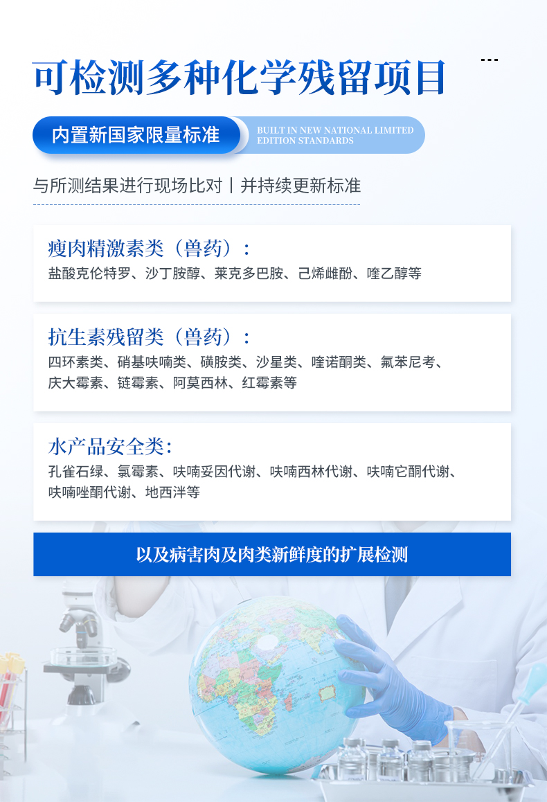 抗生素殘留檢測儀可現(xiàn)場快速檢測抗生素類殘留、獸藥殘留、激素類殘留、毒素類殘留,化學(xué)類殘留等多種項目,如可快速檢測四環(huán)素類、硝基呋喃類、磺胺類、沙星類、喹諾酮類、氯霉素、慶大霉素、鏈霉素、喹乙醇代謝物、硫酸鏈霉素、羧芐青霉素、噻孢菌素鈉、阿莫西林、氨芐西林、紅霉素、潮霉素B、安普霉紊、桿菌肽等抗生素快速檢測;還可檢測激素類:鹽酸克倫特羅、沙丁胺醇、萊克多巴胺、己烯雌酚等,水產(chǎn)獸藥:呋喃妥因代謝、呋喃西林代謝、呋喃它酮代謝、呋喃唑酮代謝、孔雀石綠等,毒素類:黃曲酶毒素B1、嘔吐毒素、玉米赤霉烯酮、赭曲霉毒素A等,化學(xué)類藥物:氨丙琳、甲基吡啶磷、阿滅丁、雙甲脒、阿散酸、阿維菌素、氮哌酮、芐青霉家、頭孢噻呋、克拉維酸、氯羥吡啶等。