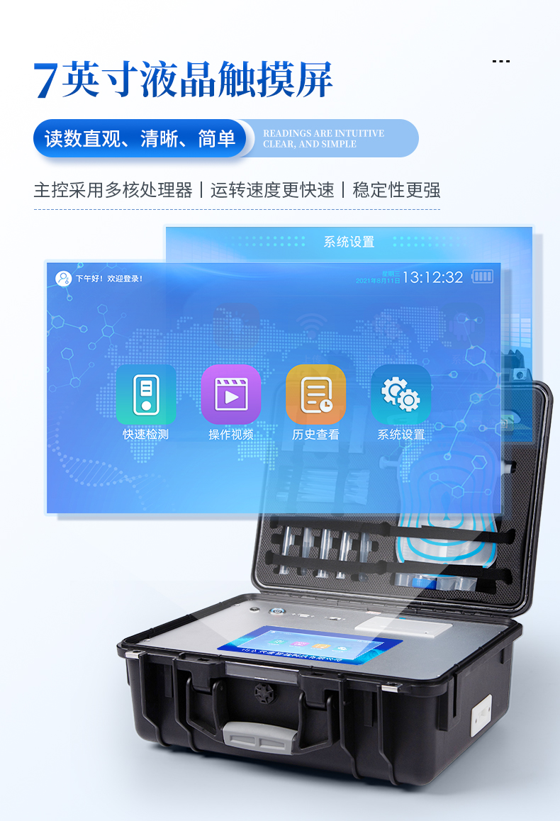 | 主控芯片采用ARM Cortex-A7,RK3288/4核處理器,主頻1.88Ghz,運(yùn)轉(zhuǎn)速度更快速,穩(wěn)定性更強(qiáng)。 | 顯示方式:7英寸液晶觸摸屏顯示,人性化中文操作界面,讀數(shù)直觀、簡單。 | 交直流兩用,直流12V供電,可連接車載電源,可配6ah大容量充電鋰電池,方便戶外流動測試。 | 光源亮度自動調(diào)節(jié)與校準(zhǔn) | 智能恒流穩(wěn)壓,光強(qiáng)自動校準(zhǔn),長時間連續(xù)工作光源無溫漂現(xiàn)象。 | 內(nèi)置新國家限量標(biāo)準(zhǔn),與所測結(jié)果進(jìn)行現(xiàn)場比對,并持續(xù)更新標(biāo)準(zhǔn)。 | 不間斷進(jìn)樣,連續(xù)檢測 | 樣本編號自動累加。 | 檢測項目可擴(kuò)充。 | 檢測結(jié)果可批量打印,批量上傳。 | 檢測結(jié)果為Excel表格,連接電腦即可拷貝 | 檢測結(jié)果存儲容量20萬條 | 標(biāo)準(zhǔn)USB接口,免驅(qū)動安裝。 | 固件可升級 |