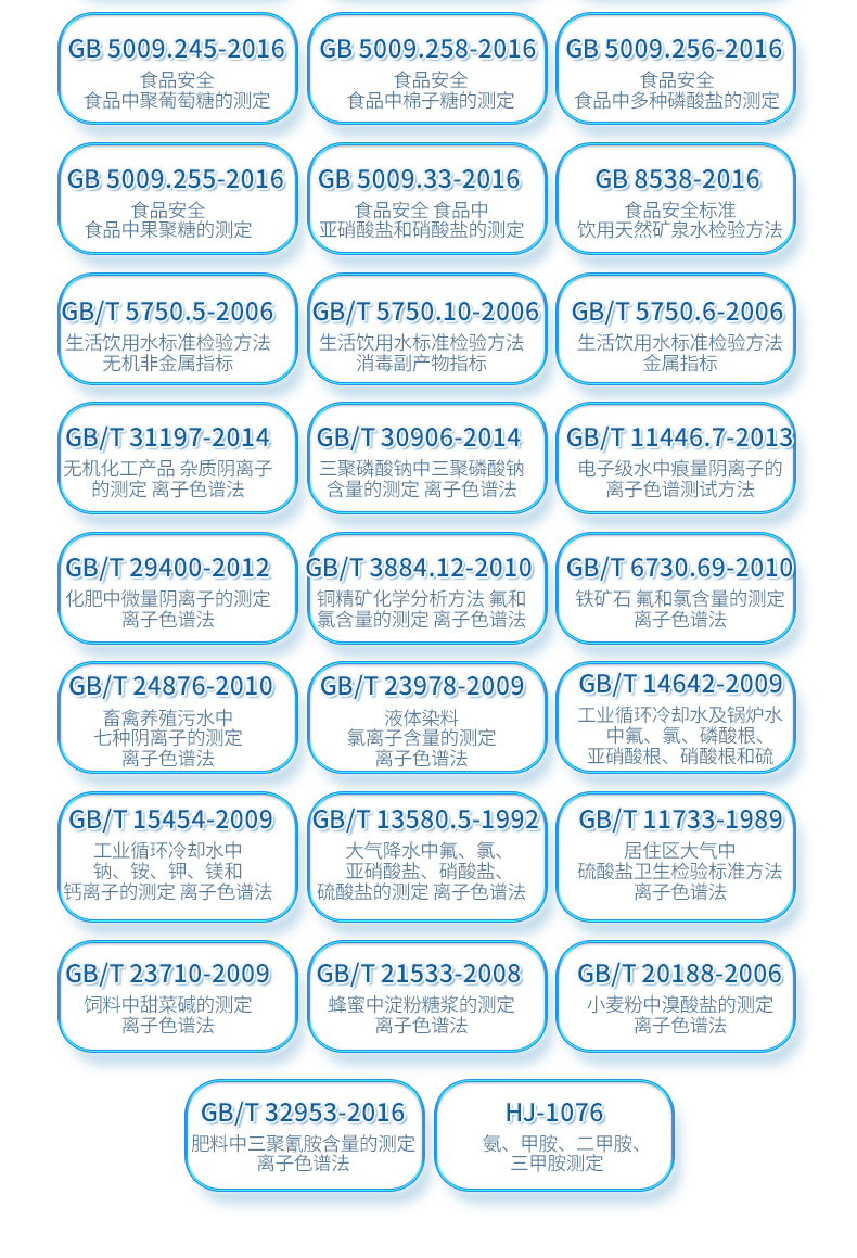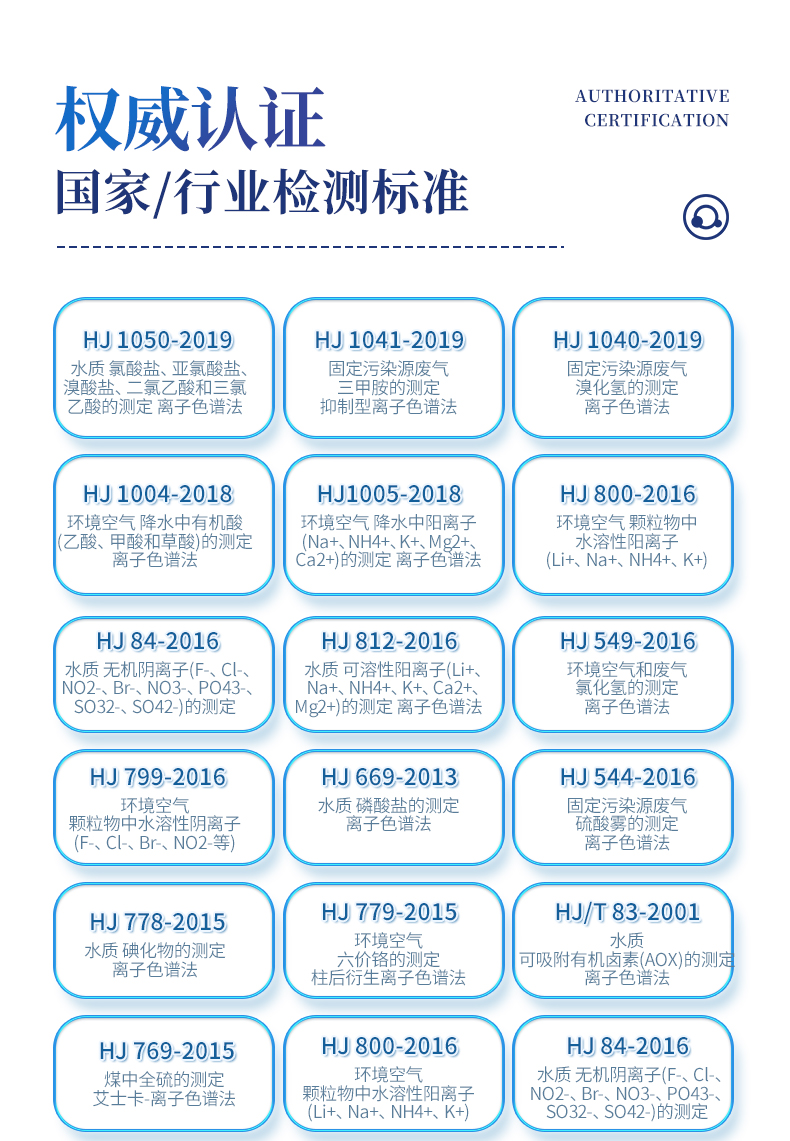 | HJ 1050-2019:水質(zhì) 氯酸鹽、亞氯酸鹽、溴酸鹽、二氯乙酸和三氯乙酸的測(cè)定 離子色譜法 | HJ 1041-2019 固定污染源廢氣 三甲胺的測(cè)定 抑制型離子色譜法 | HJ 1040-2019 固定污染源廢氣 溴化氫的測(cè)定 離子色譜法 | HJ 1004-2018 環(huán)境空氣 降水中有機(jī)酸(乙酸、甲酸和草酸)的測(cè)定 離子色譜法 | HJ1005-2018 環(huán)境空氣 降水中陽離子(Na+、NH4+、K+、Mg2+、Ca2+)的測(cè)定 離子色譜法 | HJ 800-2016 環(huán)境空氣 顆粒物中水溶性陽離子(Li+、Na+、NH4+、K+) | HJ 84-2016 水質(zhì) 無機(jī)陰離子(F-、Cl-、NO2-、Br-、NO3-、PO43-、SO32-、SO42-)的測(cè)定 | HJ 812-2016 水質(zhì) 可溶性陽離子(Li+、Na+、NH4+、K+、Ca2+、Mg2+)的測(cè)定 離子色譜法 | HJ 549-2016 環(huán)境空氣和廢氣 氯化氫的測(cè)定 離子色譜法 | HJ 799-2016 環(huán)境空氣 顆粒物中水溶性陰離子(F-、Cl-、Br-、NO2-等) | HJ 669-2013 水質(zhì) 磷酸鹽的測(cè)定 離子色譜法 | HJ 544-2016 固定污染源廢氣 硫酸霧的測(cè)定 離子色譜法 | HJ 778-2015 水質(zhì) 碘化物的測(cè)定 離子色譜法 | HJ 779-2015 環(huán)境空氣 六價(jià)鉻的測(cè)定 柱后衍生離子色譜法 | HJ/T 83-2001 水質(zhì) 可吸附有機(jī)鹵素(AOX)的測(cè)定 離子色譜法 | HJ 769-2015 煤中全硫的測(cè)定 艾士卡-離子色譜法 | HJ 800-2016 環(huán)境空氣 顆粒物中水溶性陽離子(Li+、Na+、NH4+、K+) | HJ 84-2016 水質(zhì) 無機(jī)陰離子(F-、Cl-、NO2-、Br-、NO3-、PO43-、SO32-、SO42-)的測(cè)定 | GB 5009.245-2016 食品安全 食品中聚葡萄糖的測(cè)定 | GB 5009.258-2016 食品安全 食品中棉子糖的測(cè)定 | GB 5009.256-2016 食品安全 食品中多種磷酸鹽的測(cè)定 | GB 5009.255-2016 食品安全 食品中果聚糖的測(cè)定 | GB 5009.33-2016 食品安全 食品中亞硝酸鹽和硝酸鹽的測(cè)定 | GB 8538-2016 食品安全標(biāo)準(zhǔn) 飲用天然礦泉水檢驗(yàn)方法 | GB/T 5750.5-2006 生活飲用水標(biāo)準(zhǔn)檢驗(yàn)方法 無機(jī)非金屬指標(biāo) | GB/T 5750.10-2006 生活飲用水標(biāo)準(zhǔn)檢驗(yàn)方法 消毒副產(chǎn)物指標(biāo) | GB/T 5750.6-2006 生活飲用水標(biāo)準(zhǔn)檢驗(yàn)方法 金屬指標(biāo) | GB/T 31197-2014 無機(jī)化工產(chǎn)品 雜質(zhì)陰離子的測(cè)定 離子色譜法 | GB/T 30906-2014 三聚磷酸鈉中三聚磷酸鈉含量的測(cè)定 離子色譜法 | GB/T 11446.7-2013 電子級(jí)水中痕量陰離子的離子色譜測(cè)試方法 | GB/T 29400-2012 化肥中微量陰離子的測(cè)定 離子色譜法 | GB/T 3884.12-2010 銅精礦化學(xué)分析方法 第12部分:氟和氯含量的測(cè)定 離子色譜法 | GB/T 6730.69-2010 鐵礦石 氟和氯含量的測(cè)定 離子色譜法 | GB/T 24876-2010 畜禽養(yǎng)殖污水中七種陰離子的測(cè)定 離子色譜法 | GB/T 23978-2009 液體染料 氯離子含量的測(cè)定 離子色譜法 | GB/T 14642-2009 工業(yè)循環(huán)冷卻水及鍋爐水中氟、氯、磷酸根、亞硝酸根、硝酸根和硫 | GB/T 15454-2009 工業(yè)循環(huán)冷卻水中鈉、銨、鉀、鎂和鈣離子的測(cè)定 離子色譜法 | GB/T 23710-2009 飼料中甜菜堿的測(cè)定 離子色譜法 | GB/T 21533-2008 蜂蜜中淀粉糖漿的測(cè)定 離子色譜法 | GB/T 20188-2006 小麥粉中溴酸鹽的測(cè)定 離子色譜法 | GB/T 13580.5-1992 大氣降水中氟、氯、亞硝酸鹽、硝酸鹽、硫酸鹽的測(cè)定 離子色譜法 | GB/T 32953-2016 肥料中三聚氰胺含量的測(cè)定 離子色譜法 | GB/T 11733-1989 居住區(qū)大氣中硫酸鹽衛(wèi)生檢驗(yàn)標(biāo)準(zhǔn)方法 離子色譜法 | HJ-1076 氨、甲胺、二甲胺、三甲胺測(cè)定 |