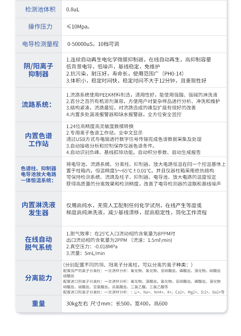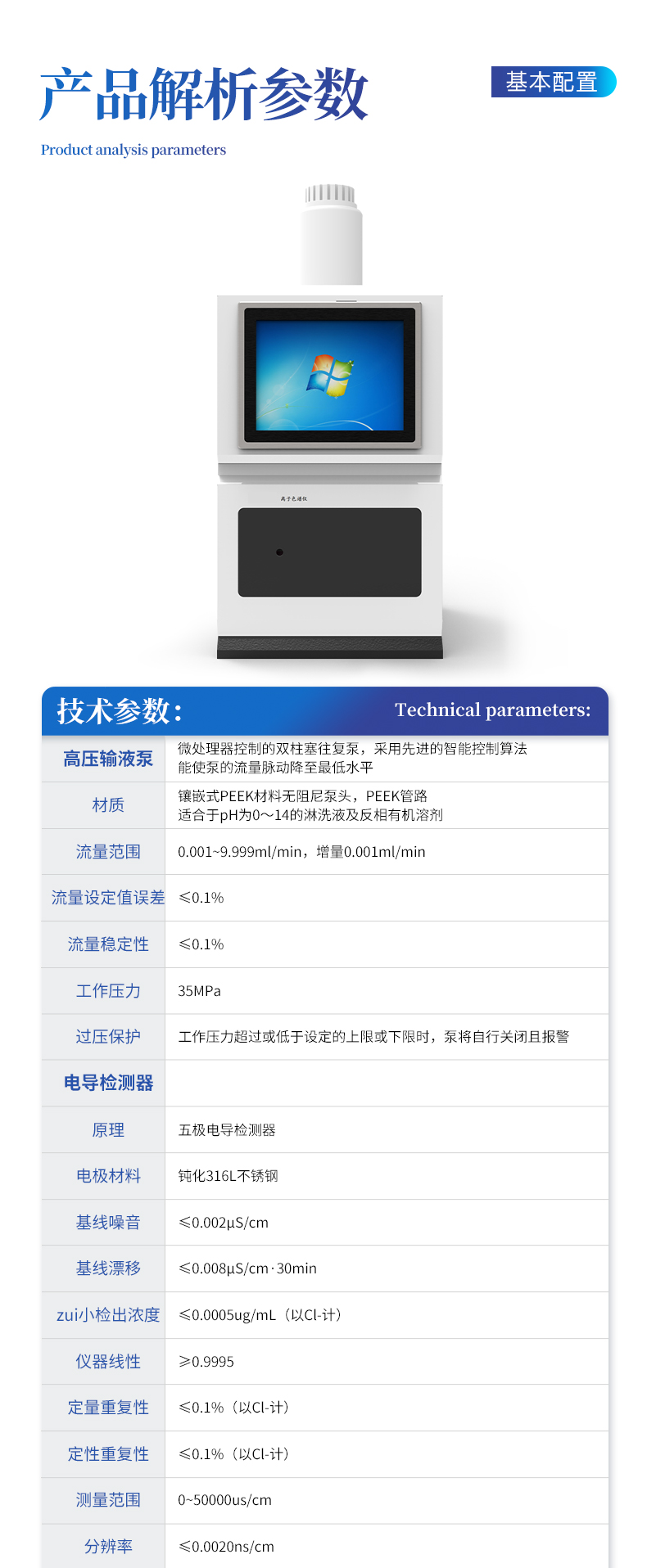 | 1 高壓輸液泵: 微處理器控制的雙柱塞往復(fù)泵,采用**的智能控制算法,能使泵的流量脈動(dòng)降至**水平。 1.1,材質(zhì):鑲嵌式PEEK材料無阻尼泵頭,PEEK管路,適合于pH為0~14的淋洗液及反相有機(jī)溶劑。 1.2,流量范圍:0.001~9.999ml/min,增量0.001ml/min。 1.3,流量設(shè)定值誤差:≤0.1% 1.4,流量穩(wěn)定性:≤0.1% 1.5,工作壓力:35MPa 1.6,過壓保護(hù):工作壓力超過或低于設(shè)定的上限或下限時(shí),泵將自行關(guān)閉且報(bào)警。 | 2 電導(dǎo)檢測(cè)器: 2.1,原理:五極電導(dǎo)檢測(cè)器 2.2,電極材料:鈍化316L不銹鋼 2.3,基線噪音:≤0.002μS/cm 2.4,基線漂移:≤0.008μS/cm·30min 2.5,zui小檢出濃度:≤0.0005ug/mL(以Cl-計(jì)) 2.6,儀器線性:≥0.9995 2.7,定量重復(fù)性:≤0.1%(以Cl-計(jì)) 2.8,定性重復(fù)性:≤0.1%(以Cl-計(jì)) 2.9,測(cè)量范圍:0~50000us/cm 2.10,分辨率:≤0.0020ns/cm 2.11,檢測(cè)池體積:0.8uL 2.12,操作壓力:≤10Mpa。 2.13,電導(dǎo)檢測(cè)量程: 0-50000uS,10檔可調(diào)。 | 3、 陰、陽離子抑制器: 3.1連續(xù)自動(dòng)再生電化學(xué)微膜抑制器,在線自動(dòng)再生,高抑制容量,低背景電導(dǎo),低噪聲,基線穩(wěn)定,免維護(hù)。 3.2抗污染,耐壓好,壽命長(zhǎng),使用范圍廣(PH0-14)。 3.3體積小,穩(wěn)定時(shí)間快,穩(wěn)定時(shí)間不大于12分鐘,且重現(xiàn)性好。 | 4 流路系統(tǒng): 4.1流路系統(tǒng)使用PEEK材料制造,通用性好,能使用強(qiáng)酸、強(qiáng)堿的淋洗液。 4.2百分之百的有機(jī)溶劑兼容,方便用戶對(duì)復(fù)雜樣品進(jìn)行分析、沖洗和維護(hù)。 4.3 結(jié)構(gòu)緊湊,流路*短,對(duì)流路造成的峰型擴(kuò)展有很好的改善。 4.4 內(nèi)置多處漏液報(bào)警器和缺水報(bào)警器,全方位安全監(jiān)控。 | 5 內(nèi)置色譜工作站: 5.1 24位高精度高靈敏度數(shù)模轉(zhuǎn)換。 5.2專用離子色譜工作站,全中文顯示,通過USB方式與電腦進(jìn)行數(shù)字信號(hào)傳輸,完成色譜數(shù)據(jù)采集及處理。 5.3自動(dòng)接收分析和控制保存儀器色譜條件。 5.4自動(dòng)識(shí)別負(fù)峰、基線扣除功能。自動(dòng)積分參數(shù)、自動(dòng)生成報(bào)告。 | 6 色譜柱、抑制器、電導(dǎo)池、放大電路一體恒溫系統(tǒng): 將電導(dǎo)池、流路系統(tǒng)、分離柱、抑制器、放大電路恒溫在同一個(gè)控溫基體上置于柱箱內(nèi),恒溫精度5~65℃±0.01℃。并且儀器柱箱采用絕熱結(jié)構(gòu),可保持檢測(cè)系統(tǒng)、流路及柱子、抑制器、電導(dǎo)池、放大電路的溫度恒定,獲得高質(zhì)量的分離效果和檢測(cè)精度,改善了電導(dǎo)檢測(cè)器的溫飄和基線噪聲。 | 7內(nèi)置淋洗液發(fā)生器,僅用高純水,無需人工配制任何化學(xué)試劑,在線產(chǎn)生等度或梯度高純淋洗液,減少基線漂移,提高穩(wěn)定性,簡(jiǎn)化工作流程。 | 8 在線自動(dòng)脫氣系統(tǒng): 1,脫氣效率:在25℃入口流動(dòng)相的含氧量為8PPM時(shí),出口流動(dòng)相的含氧量為2PPM (流速:1.5ml\min) 2,真空壓力:-0.018MPa 3,流量:5mL/min | 9 分離能力:(分別配置不同的陰、陽離子分離柱,可以分離的離子種類:) 配置國產(chǎn)陰離子分離柱:一次進(jìn)樣分析:氟化物、氯化物、亞硝酸鹽、磷酸鹽、溴化物、硝酸鹽、硫酸鹽 配置進(jìn)口陰離子分離柱:一次進(jìn)樣分析:氟化物、溴酸鹽、氯化物、亞硝酸鹽、磷酸鹽、溴化物、硝酸鹽、硫酸鹽、亞氯酸鹽、高氯酸鹽、二氯乙酸、三氯乙酸等 配置進(jìn)口陽離子分離柱:一次進(jìn)樣分析::Li+、Na+、NH4+、K+、Ca2+、Mg2+、Sr2+、Ba2+等 | 10 重量:30kg左右 尺寸mm:長(zhǎng)500,寬400,高600 |