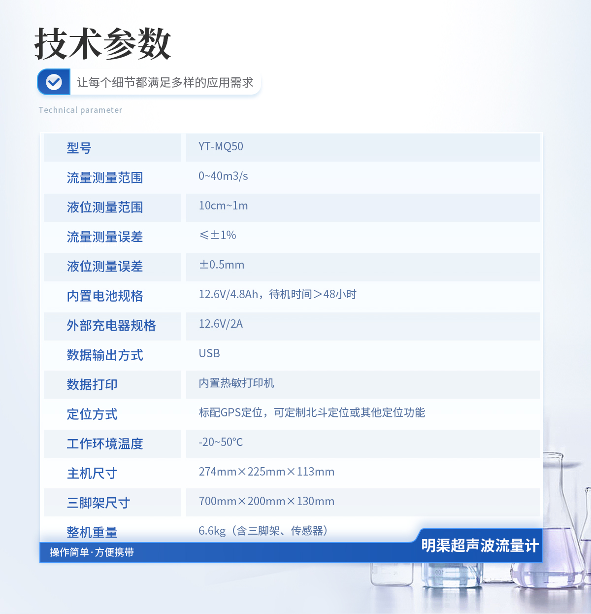 簡介:產(chǎn)品簡介:便攜式明渠流量計是專為水文監(jiān)測、江河流量監(jiān)測、農(nóng)業(yè)灌溉及市政給排水等行業(yè)設(shè)計的一種高精度測量儀表,它采用超聲波技術(shù)和特殊的微功耗設(shè)計方案,結(jié)合全數(shù)字信號處理技術(shù),確保了測量的穩(wěn)定性與可靠性。該設(shè)備具有廣泛的測量范圍和較高的測量精度,支持實時數(shù)據(jù)顯示、數(shù)據(jù)記錄、導(dǎo)出及打印等功能,操作簡便且準(zhǔn)