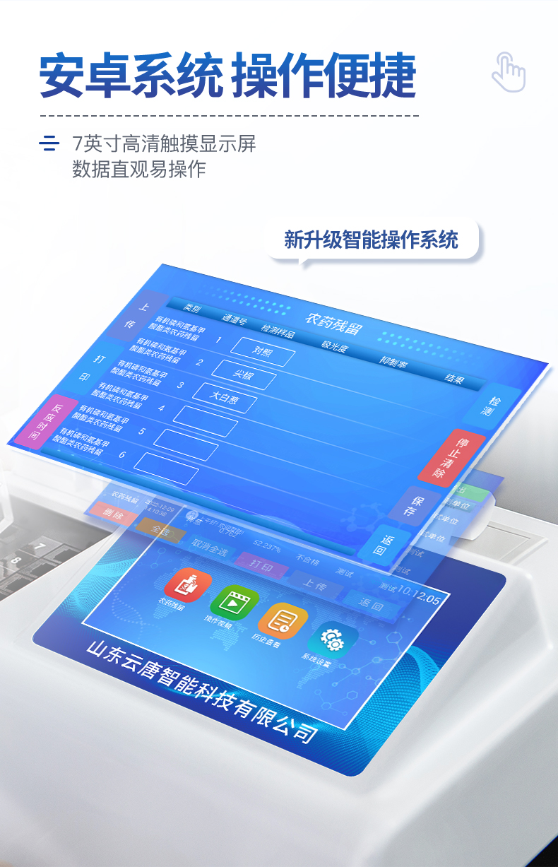 | 乙酰膽堿酯酶和丁酰膽堿酯酶試劑均可以使用,符合國家標(biāo)準(zhǔn)和農(nóng)業(yè)部標(biāo)準(zhǔn)的要求。 | 自動判斷樣品是否合格,檢測結(jié)果更加直觀。 | 儀器具有100多種蔬菜名稱菜單庫,分類管理,并可按需添加或刪除蔬菜名,編輯蔬菜名稱,可直接打印出蔬菜名稱。 | 檢測通道:12個檢測通道,可以同時測試多個樣品,循環(huán)檢測,即放即檢,每個樣品由程序控制分別獨立工作,不會互相干擾。 | 智能操作系統(tǒng),采用更加人性化操作,主控采用多核處理器,主頻1.88Ghz,運轉(zhuǎn)速度更快速,穩(wěn)定性更強。 | 顯示方式:7英寸高靈敏真彩觸摸屏顯示,人性化中文操作界面,讀數(shù)直觀、簡單。 | 打印機采用串口5v打印,可選擇手動打印或者自動打印,三分鐘出打印結(jié)果,打印格式為檢測人姓名、吸光度差值、檢測時間、檢測機構(gòu)、樣品名稱及結(jié)果判定。 | 光源采用進(jìn)口超高亮發(fā)光二極管,具有低功耗、高精度、穩(wěn)定性強、光源可控可以關(guān)掉不使用的光源,響應(yīng)速度快等優(yōu)點。 | 智能恒流穩(wěn)壓,光強自動校準(zhǔn),長時間連續(xù)工作光源無溫漂現(xiàn)象。 | 儀器具有GPRS遠(yuǎn)傳功能,可插手機卡實現(xiàn)數(shù)據(jù)遠(yuǎn)傳平臺,wifi聯(lián)網(wǎng)功能,可將數(shù)據(jù)快速上傳電腦,進(jìn)行數(shù)據(jù)管理與統(tǒng)計。 | 采用USB2.0接口設(shè)計,方便數(shù)據(jù)的存貯和移動,并可隨時與計算機直接相連,并且可用計算機控制儀器。實現(xiàn)數(shù)據(jù)查詢、瀏覽、分析、統(tǒng)計、打印等。 | 智能化程度高,儀器具有自檢功能:具有開機自檢和調(diào)零功能,具有自動檢測重復(fù)性功能 | 儀器具有自身保護(hù)功能,可設(shè)置用戶名及密碼,防止非工作人員操作等。 | 采用DC12v直流供電,安全系統(tǒng)更高,并且配備6A鋰電池充電器。 | 儀器具有重新校準(zhǔn)、鎖定、恢復(fù)出廠設(shè)置功能。 |