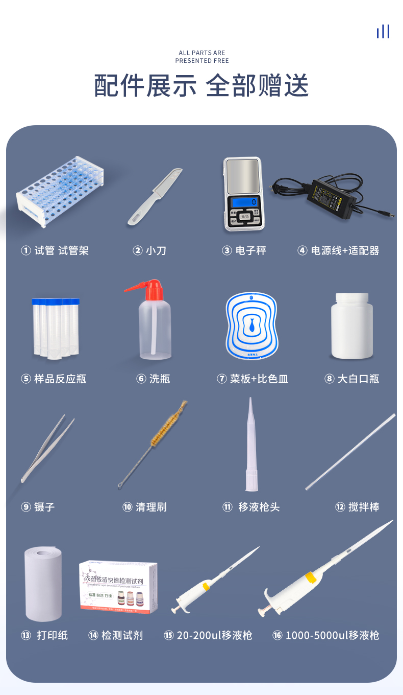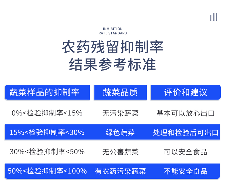 檢測(cè)標(biāo)準(zhǔn):依據(jù)國(guó)家標(biāo)準(zhǔn)方法(GB/T5009.199-2003)以及世界衛(wèi)生組織WHO、世界糧農(nóng)組織FAO殘留農(nóng)藥檢測(cè)標(biāo)準(zhǔn)、世界環(huán)境保護(hù)局EPA參照攝入量等要求來設(shè)計(jì)。采用酶抑制率比色法對(duì)水果、蔬菜等農(nóng)林產(chǎn)品中有機(jī)磷和氨基甲酸酯類農(nóng)藥含量進(jìn)行快速準(zhǔn)確的檢測(cè),乙酰膽堿酯酶和丁酰膽堿酯酶試劑均可以使用,符合國(guó)家標(biāo)準(zhǔn)和農(nóng)業(yè)部標(biāo)準(zhǔn)的要求。