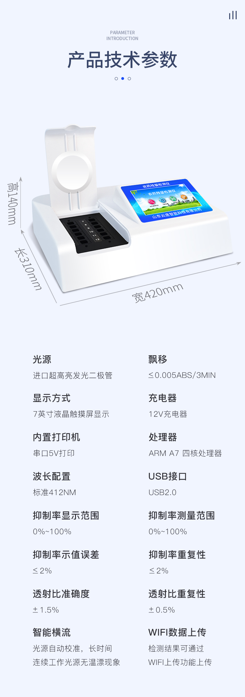 | 乙酰膽堿酯酶和丁酰膽堿酯酶試劑均可以使用,符合國(guó)家標(biāo)準(zhǔn)和農(nóng)業(yè)部標(biāo)準(zhǔn)的要求。 | 自動(dòng)判斷樣品是否合格,檢測(cè)結(jié)果更加直觀。 | 儀器具有100多種蔬菜名稱菜單庫,分類管理,并可按需添加或刪除蔬菜名,編輯蔬菜名稱,可直接打印出蔬菜名稱。 | 檢測(cè)通道:12個(gè)檢測(cè)通道,可以同時(shí)測(cè)試多個(gè)樣品,循環(huán)檢測(cè),即放即檢,每個(gè)樣品由程序控制分別獨(dú)立工作,不會(huì)互相干擾。 | 智能操作系統(tǒng),采用更加人性化操作,主控采用多核處理器,主頻1.88Ghz,運(yùn)轉(zhuǎn)速度更快速,穩(wěn)定性更強(qiáng)。 | 顯示方式:7英寸高靈敏真彩觸摸屏顯示,人性化中文操作界面,讀數(shù)直觀、簡(jiǎn)單。 | 打印機(jī)采用串口5v打印,可選擇手動(dòng)打印或者自動(dòng)打印,三分鐘出打印結(jié)果,打印格式為檢測(cè)人姓名、吸光度差值、檢測(cè)時(shí)間、檢測(cè)機(jī)構(gòu)、樣品名稱及結(jié)果判定。 | 光源采用進(jìn)口超高亮發(fā)光二極管,具有低功耗、高精度、穩(wěn)定性強(qiáng)、光源可控可以關(guān)掉不使用的光源,響應(yīng)速度快等優(yōu)點(diǎn)。 | 智能恒流穩(wěn)壓,光強(qiáng)自動(dòng)校準(zhǔn),長(zhǎng)時(shí)間連續(xù)工作光源無溫漂現(xiàn)象。 | 儀器具有GPRS遠(yuǎn)傳功能,可插手機(jī)卡實(shí)現(xiàn)數(shù)據(jù)遠(yuǎn)傳平臺(tái),wifi聯(lián)網(wǎng)功能,可將數(shù)據(jù)快速上傳電腦,進(jìn)行數(shù)據(jù)管理與統(tǒng)計(jì)。 | 采用USB2.0接口設(shè)計(jì),方便數(shù)據(jù)的存貯和移動(dòng),并可隨時(shí)與計(jì)算機(jī)直接相連,并且可用計(jì)算機(jī)控制儀器。實(shí)現(xiàn)數(shù)據(jù)查詢、瀏覽、分析、統(tǒng)計(jì)、打印等。 | 智能化程度高,儀器具有自檢功能:具有開機(jī)自檢和調(diào)零功能,具有自動(dòng)檢測(cè)重復(fù)性功能 | 儀器具有自身保護(hù)功能,可設(shè)置用戶名及密碼,防止非工作人員操作等。 | 采用DC12v直流供電,安全系統(tǒng)更高,并且配備6A鋰電池充電器。 | 儀器具有重新校準(zhǔn)、鎖定、恢復(fù)出廠設(shè)置功能。 |