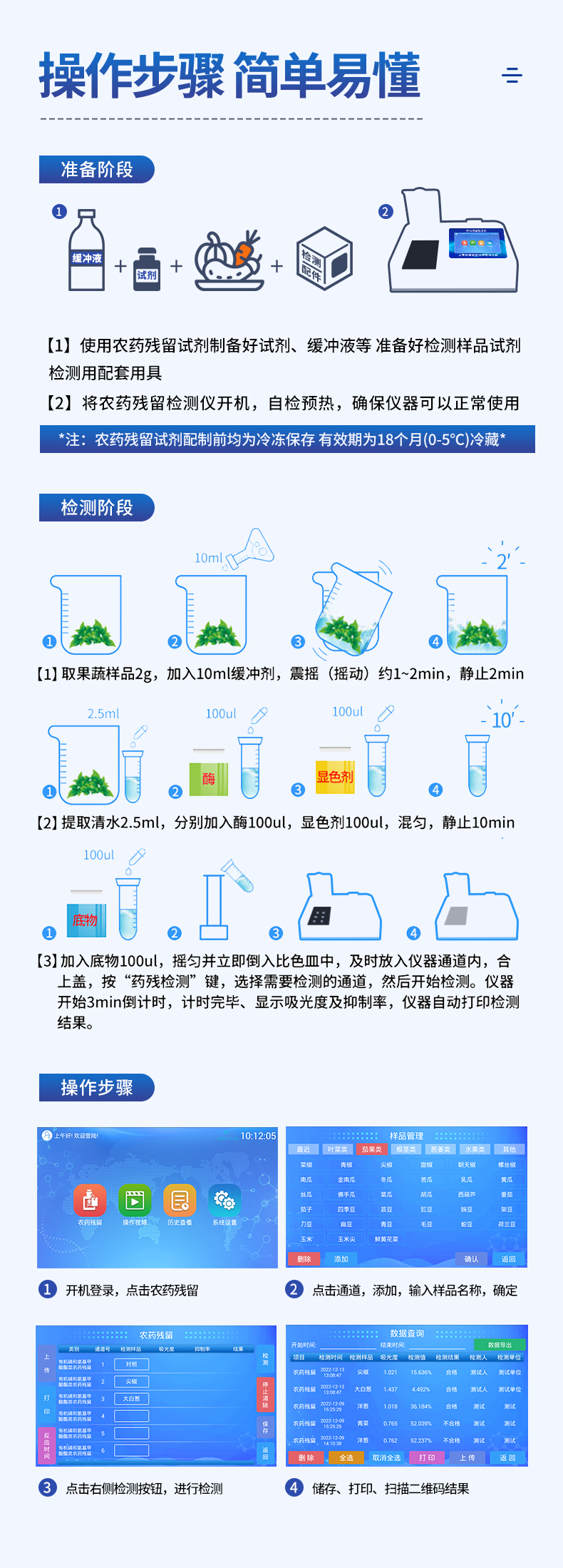 檢測標(biāo)準(zhǔn):依據(jù)國家標(biāo)準(zhǔn)方法(GB/T5009.199-2003)以及世界衛(wèi)生組織WHO、世界糧農(nóng)組織FAO殘留農(nóng)藥檢測標(biāo)準(zhǔn)、世界環(huán)境保護(hù)局EPA參照攝入量等要求來設(shè)計(jì)。采用酶抑制率比色法對水果、蔬菜等農(nóng)林產(chǎn)品中有機(jī)磷和氨基甲酸酯類農(nóng)藥含量進(jìn)行快速準(zhǔn)確的檢測。