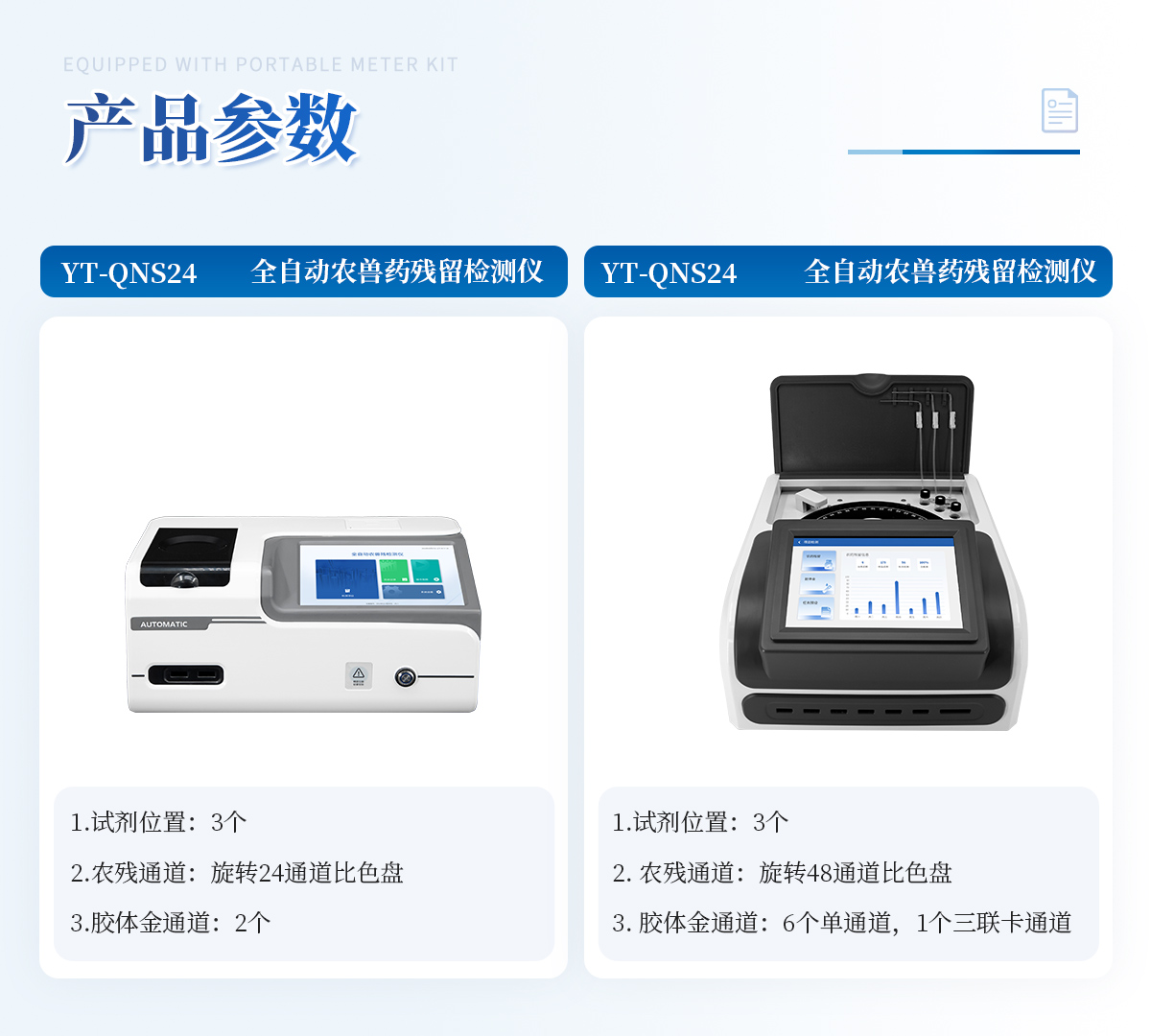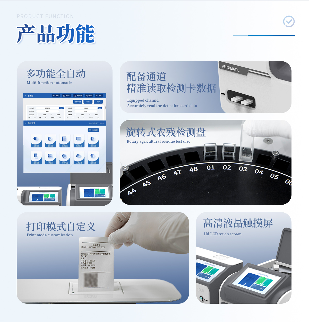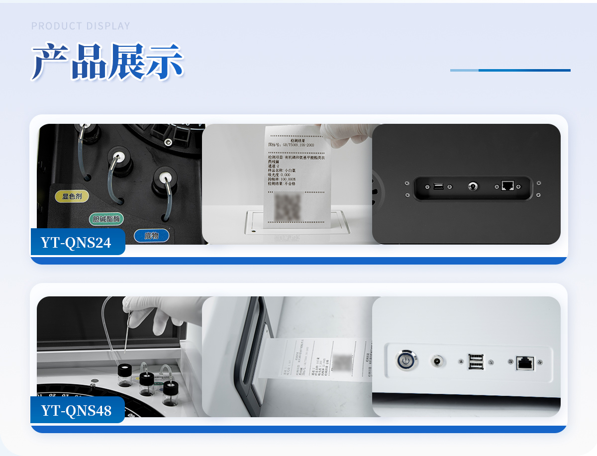 | 1. 試劑位置:3個(gè) | 2. 農(nóng)殘檢測(cè)盤(pán):旋轉(zhuǎn)48通道比色盤(pán),可任意選擇檢測(cè)通道,自動(dòng)對(duì)應(yīng)選擇通道。 | 3. 膠體金通道:6個(gè)單通道,1個(gè)三聯(lián)卡通道,可讀取檢測(cè)卡結(jié)果,自動(dòng)采集、處理分析,自動(dòng)判斷檢測(cè)結(jié)果,并具備自動(dòng)判空功能。 | 4.系統(tǒng)配置:10.1寸高清液晶觸摸屏,采用ARM Cortex-A7,RK3288/4核處理器,運(yùn)行內(nèi)存1GB。Android7.1.1 系統(tǒng)分辨率1280×800。 | 5.恒溫系統(tǒng):具有自動(dòng)加溫溫控系統(tǒng),精準(zhǔn)恒溫37℃,精度±0.1℃。 | 6.添加系統(tǒng):儀器按照試劑要求自動(dòng)、按時(shí)、按量加入試劑,并且自動(dòng)對(duì)未正常放置的樣本或異常的樣本進(jìn)行檢查并提示。 | 7.清洗功能:儀器具備回流及自動(dòng)清洗管路功能,避免試劑污染。 | 8.混勻功能:設(shè)備具備自動(dòng)混勻功能。 | 9.光源校準(zhǔn):設(shè)備可自動(dòng)校準(zhǔn),確保檢測(cè)準(zhǔn)確度。 | 10.實(shí)時(shí)監(jiān)控:儀器測(cè)試過(guò)程中屏幕顯示運(yùn)行狀態(tài),可實(shí)時(shí)查看。 | 11.數(shù)據(jù)存儲(chǔ):內(nèi)部存儲(chǔ)16GB,可存儲(chǔ)500萬(wàn)條數(shù)據(jù)。 | 12.樣品多選功能:設(shè)備具備樣品一鍵多選功能,選擇樣品自動(dòng)匹配檢測(cè)通道。 | 13.項(xiàng)目預(yù)設(shè):可提前設(shè)置單個(gè)及多個(gè)相同或不相同的檢測(cè)任務(wù),可單次或者多次調(diào)取,減少檢測(cè)時(shí)間。 | 14.自定義打印系統(tǒng):內(nèi)置自定義打印系統(tǒng),可按需靈活設(shè)置開(kāi)啟或關(guān)閉:產(chǎn)品合格證(國(guó)家農(nóng)業(yè)部標(biāo)準(zhǔn)),二維碼,抽樣信息、檢測(cè)信息,受檢信息等信息的打印。 | 15.A4版本報(bào)告打印功能:設(shè)備可自動(dòng)生成A4版報(bào)告,A4報(bào)告帶二維碼,可掃描二維碼生成電子版,并可識(shí)別真?zhèn)巍? | 16.傳輸方式:儀器配備無(wú)線通信模塊: 4G(APN)通訊模塊、Wifi模塊,藍(lán)牙傳輸模塊,同時(shí)具有USB接口以及RJ45接口能以多種方式實(shí)現(xiàn)數(shù)據(jù)保存和數(shù)據(jù)傳輸功能,設(shè)備數(shù)據(jù)可以同步上傳至平臺(tái)。 | 17.數(shù)據(jù)監(jiān)管系統(tǒng):設(shè)備自帶監(jiān)管平臺(tái),并可同步對(duì)接監(jiān)管平臺(tái),數(shù)據(jù)可局域網(wǎng)和互聯(lián)網(wǎng)數(shù)據(jù)上傳,檢測(cè)結(jié)果可直接傳至食品安全監(jiān)管平臺(tái)。達(dá)到食品安全問(wèn)題預(yù)估、預(yù)警。 | 18.系統(tǒng)遠(yuǎn)程更新功能:無(wú)需設(shè)備返廠,即可遠(yuǎn)程實(shí)時(shí)升級(jí)全新系統(tǒng),節(jié)省時(shí)間成本及避免運(yùn)輸造成設(shè)備損。 |