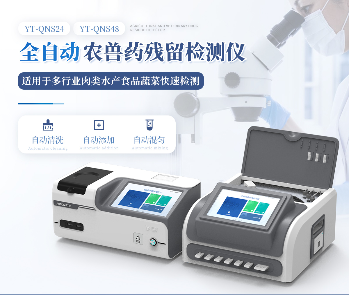全自動(dòng)農(nóng)獸藥殘留檢測(cè)儀可對(duì)各種蔬菜水果中有機(jī)磷和氨基甲酸酯類(lèi)農(nóng)藥殘留;各種肉類(lèi)水產(chǎn)食品中瘦肉精激素類(lèi)殘留,抗生素殘留,獸藥殘留,水產(chǎn)品藥物殘留等百余種項(xiàng)目進(jìn)行快速檢測(cè)。該設(shè)備廣泛應(yīng)用于蔬菜批發(fā)市場(chǎng)、超市、商場(chǎng)、食藥監(jiān)等部門(mén)的蔬菜和水果中的農(nóng)藥殘留檢測(cè)。