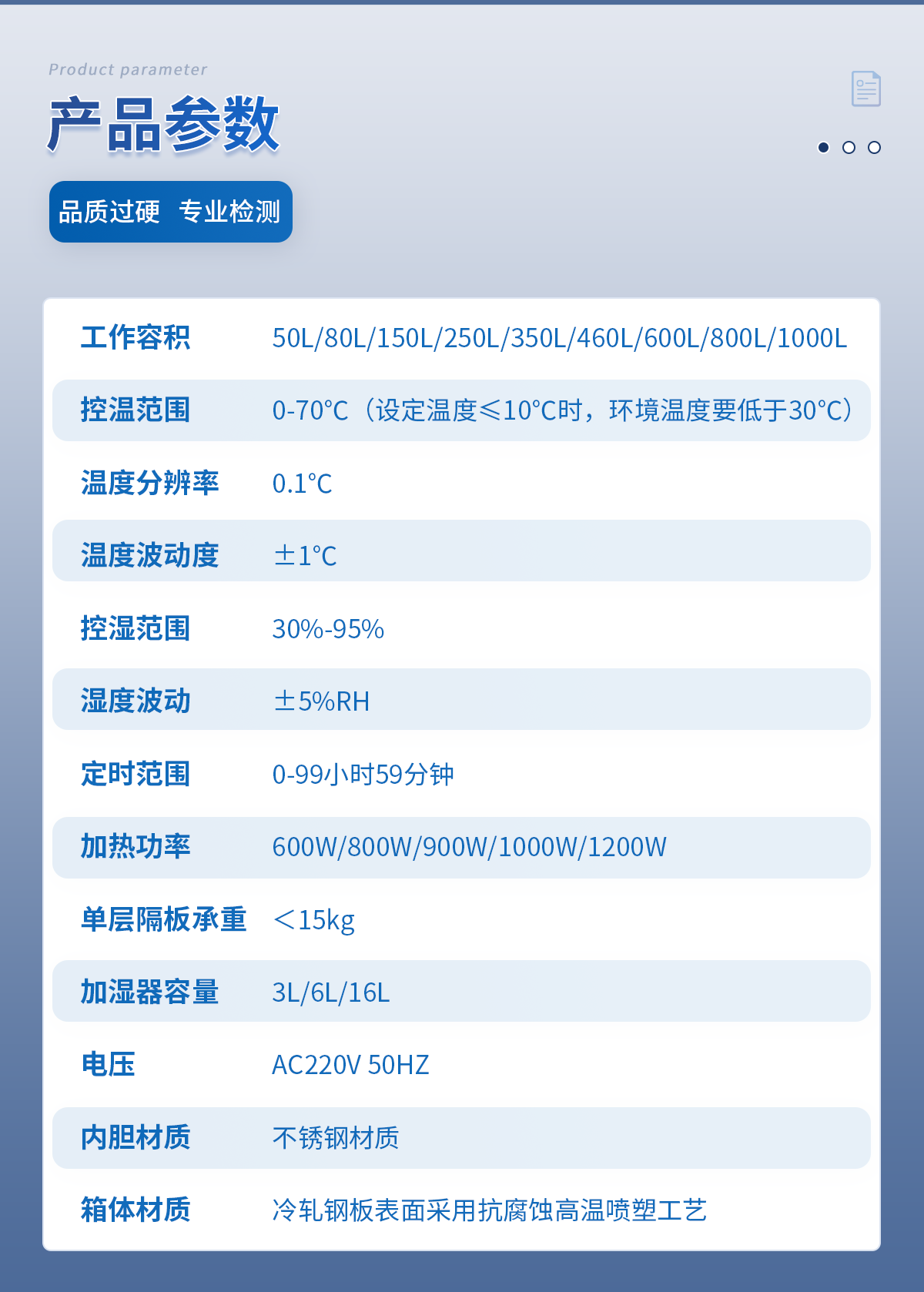 | 工作容積:800L | 箱內(nèi)照明:日光燈 | 控溫范圍:0-70℃(設(shè)定溫度≤10℃時(shí)環(huán)境溫度要低于30℃) | 程序控制:24段 | 溫度分辨率:0.1℃ | 溫度波動(dòng)度:±0.5℃ | 控濕范圍:30%-95% | 定時(shí)范圍:0-99小時(shí)59分鐘 | 加熱功率:1200W | 內(nèi)箱尺寸 寬*深*高(cm):85*85*110 | 外箱尺寸 寬*深*高(cm):99*115*174 | 隔板層數(shù)(標(biāo)配):3層 | 加濕器容量(標(biāo)配):16L | 單層隔板承重:<25kg | 底部總承重:50kg | 層間隔/mm:80 | 卡槽層數(shù):8 | 電壓:AC220V 50HZ | 整機(jī)重量:166kg | 內(nèi)膽材質(zhì):不銹鋼材質(zhì) | 箱體材質(zhì):冷軋鋼板表面采用抗腐蝕高溫噴塑工藝 |