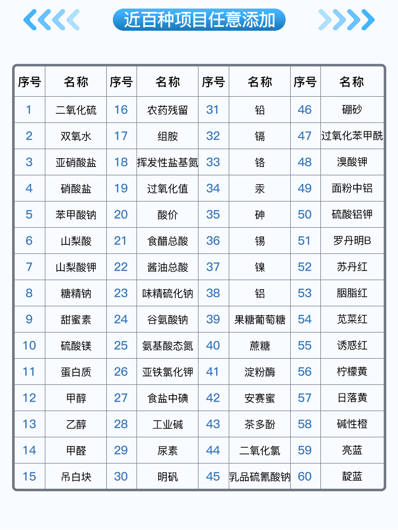 可快速檢測(cè)各類(lèi)食品中的甲醛、二氧化硫、亞硝酸鹽、吊白塊的含量,儀器預(yù)留其他項(xiàng)目檢測(cè)程序和端口,根據(jù)日后需求可方便的自主增加檢測(cè)項(xiàng)目。