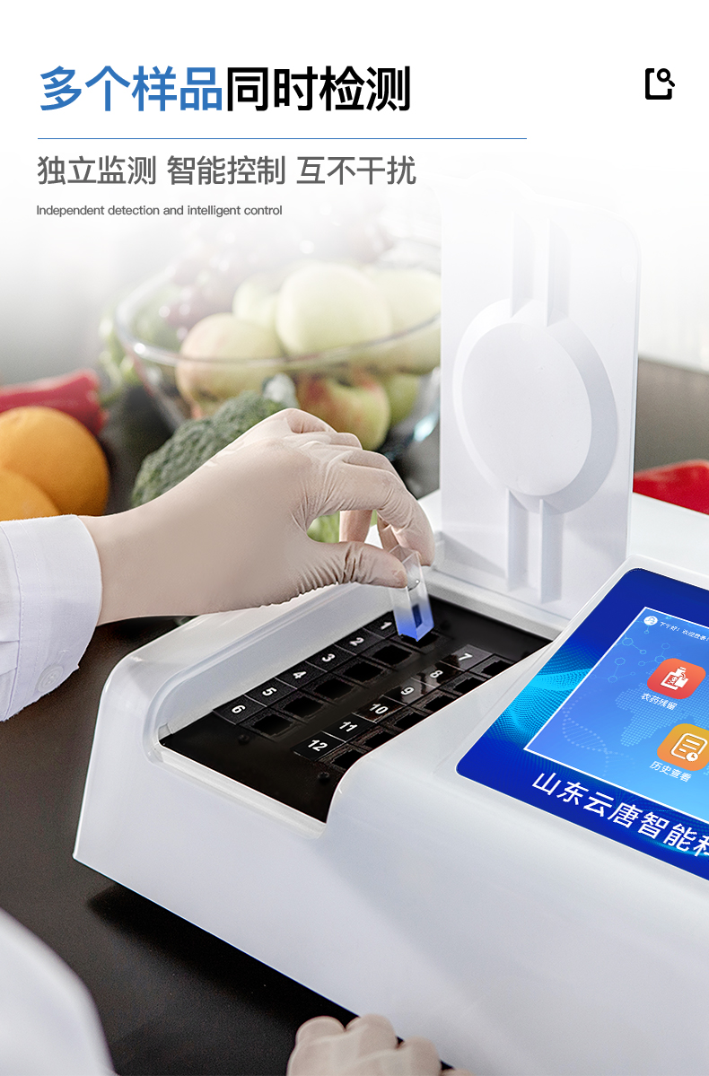 | 安卓智能操作系統(tǒng),采用更加**和人性化操作,儀器具有網(wǎng)線連接、wifi聯(lián)網(wǎng)上傳、GPRS無(wú)線遠(yuǎn)傳功能,快速上傳數(shù)據(jù)。 | 智能化程度高,儀器具有自檢功能:具有開(kāi)機(jī)自檢和調(diào)零功能,具有自動(dòng)檢測(cè)重復(fù)性功能。 | 檢測(cè)通道:≥12個(gè)檢測(cè)通道,可以同時(shí)測(cè)試多個(gè)樣品,每個(gè)樣品由程序控制分別獨(dú)立工作,不會(huì)互相干擾。 | 顯示方式:≥8英寸液晶觸摸屏顯示,人性化中文操作界面,讀數(shù)直觀、簡(jiǎn)單。 | 配備新一代嵌入式熱敏打印機(jī),可選擇手動(dòng)打印或者自動(dòng)打印,檢測(cè)完成可自動(dòng)打印檢測(cè)報(bào)告和二維碼。 | 光源采用進(jìn)口超高亮發(fā)光二極管,高精度、穩(wěn)定性強(qiáng)、光源可控、可以關(guān)掉不使用的光源,功耗更低。 | 采用USB2.0接口設(shè)計(jì),方便數(shù)據(jù)的存貯和移動(dòng),并可隨時(shí)與計(jì)算機(jī)直接相連,并且可用計(jì)算機(jī)控制儀器。實(shí)現(xiàn)數(shù)據(jù)查詢(xún)、瀏覽、分析、統(tǒng)計(jì)、打印等。 | 儀器帶有監(jiān)管平臺(tái)。數(shù)據(jù)可局域網(wǎng)和互聯(lián)網(wǎng)數(shù)據(jù)上傳,檢測(cè)結(jié)果直接傳至食品安全監(jiān)管平臺(tái)。進(jìn)行區(qū)域食品安全監(jiān)管及大數(shù)據(jù)分析處理,檢測(cè)區(qū)域食品安全長(zhǎng)短期動(dòng)態(tài),達(dá)到食品安全問(wèn)題預(yù)估、預(yù)警 | 一體化便攜式快檢設(shè)備,滿足現(xiàn)場(chǎng)及流動(dòng)檢測(cè)使用需求,能夠在同一軟件下實(shí)現(xiàn)所有檢測(cè)項(xiàng)目的檢測(cè),并可通過(guò)同一窗口直觀顯示檢測(cè)結(jié)果。 | 儀器具有多品類(lèi)多種類(lèi)樣品菜單庫(kù),可靈活選擇檢測(cè)樣品,不同的檢測(cè)通道可同時(shí)檢測(cè)不同的樣品項(xiàng)目。也可在儀器上直接編輯錄入樣品名稱(chēng)、檢測(cè)指標(biāo)、送檢單位等信息并保存進(jìn)樣品數(shù)據(jù)庫(kù)。 | 樣品處理簡(jiǎn)單省力,整體操作快速、安全、便捷。 | 儀器具有自身保護(hù)功能,可設(shè)置用戶(hù)名及密碼,防止非工作人員操作等。 | 高靈敏度,高檢測(cè)精度,高重復(fù)性精度,掃描式高精度光學(xué)傳感器。 | 內(nèi)置強(qiáng)大的數(shù)據(jù)庫(kù),可在儀器上直接選擇樣品名稱(chēng)、檢測(cè)指標(biāo)、送檢單位等信息,也可在儀器上直接編輯錄入樣品名稱(chēng)、檢測(cè)指標(biāo)、送檢單位等信息并保存進(jìn)樣品數(shù)據(jù)庫(kù)。 | 儀器具有重新校準(zhǔn)、鎖定、恢復(fù)出廠設(shè)置功能。 | 支持U盤(pán)存儲(chǔ)。 結(jié)果判定線可修改,對(duì)照值標(biāo)定值可保存,斷電不丟失數(shù)據(jù)。 |