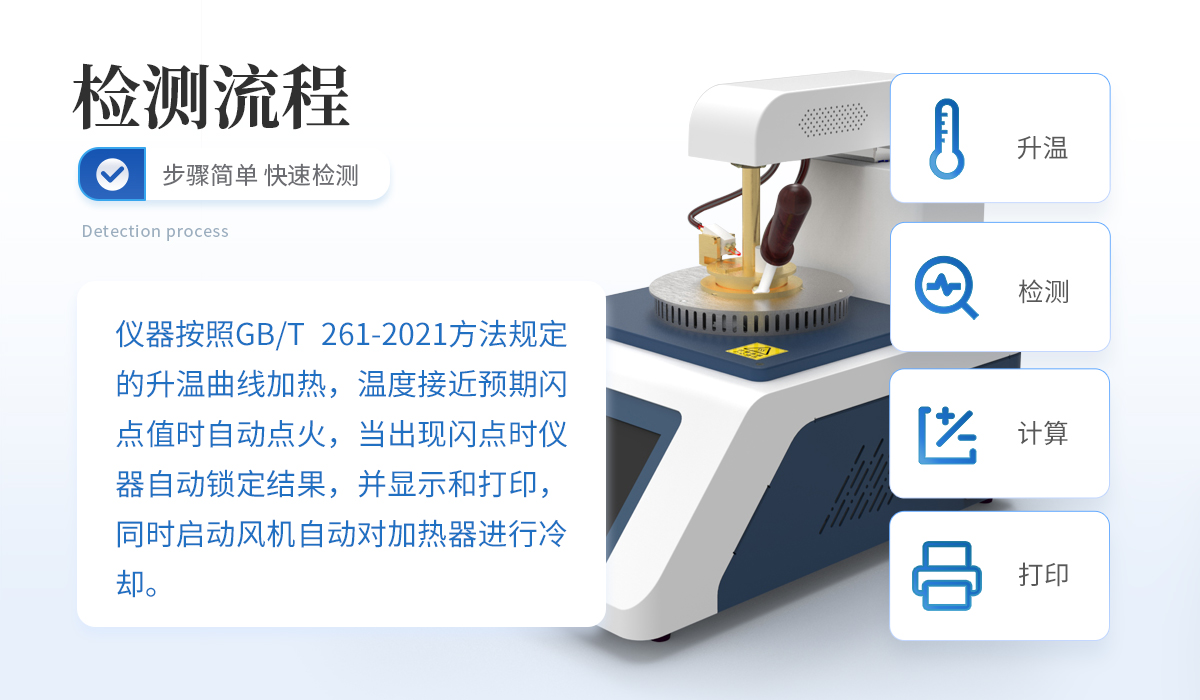 儀器按照GB/T 261-2021方法規(guī)定的升溫曲線加熱,溫度接近預(yù)期閃點(diǎn)值時(shí)自動(dòng)點(diǎn)火,當(dāng)出現(xiàn)閃點(diǎn)時(shí)儀器自動(dòng)鎖定結(jié)果,并顯示和打印,同時(shí)啟動(dòng)風(fēng)機(jī)自動(dòng)對(duì)加熱器進(jìn)行冷卻。
