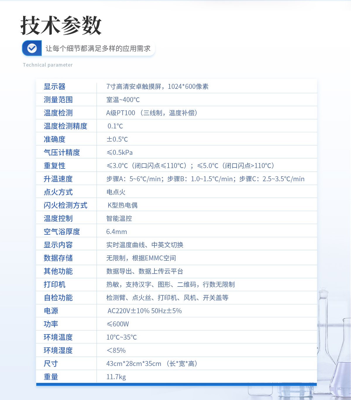 顯示器:7寸高清安卓觸摸屏,1024*600像素測量范圍:室溫~400℃            溫度檢測: A級(jí)PT100 (三線制,溫度補(bǔ)償)溫度檢測精度:0.1℃            氣壓計(jì)精度: ≤0.5kPa重復(fù)性:≤3.0℃(閉口閃點(diǎn)≤110℃);≤5.0℃(閉口閃點(diǎn)>110℃)            升溫速度:步驟A:5~6℃/min;步驟B:1.0~1.5℃/min;步驟C:2.5~3.5℃/min點(diǎn)火方式:電點(diǎn)火            閃火檢測方式:K型熱電偶溫度控制:智能溫控            空氣浴厚度:6.4mm顯示內(nèi)容:實(shí)時(shí)溫度曲線、中英文切換            數(shù)據(jù)存儲(chǔ):無限制,根據(jù)EMMC空間其他功能:數(shù)據(jù)導(dǎo)出、數(shù)據(jù)上傳云平臺(tái)            打印機(jī):熱敏,支持漢字、圖形、二維碼,行數(shù)無限制自檢功能:檢測臂、點(diǎn)火絲、打印機(jī)、風(fēng)機(jī)、開關(guān)蓋等            電源:AC220V±10% 50Hz±5%功率:≤600W            環(huán)境溫度:10℃~35℃環(huán)境濕度:<85%            尺寸:43cm*28cm*35cm (長*寬*高)重量:11.7kg