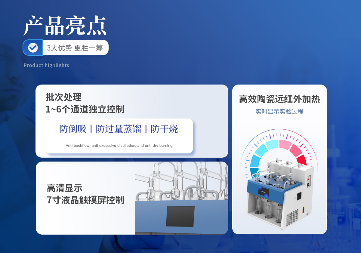 各級實驗室的前處理實驗過程中,蒸餾實驗是非常常見且又非常重要的一項前處理步驟。但傳統(tǒng)的蒸餾裝置由于加熱,冷凝,接收等裝置部分結(jié)構(gòu)獨立,操作繁瑣,效率較低,故障率高,蒸餾過程中加熱溫度不易控制,終點無法自動判斷停止,餾出液易倒吸,相應(yīng)帶來平行性差,回收率低等直接影響實驗結(jié)果的現(xiàn)象等各種弊端。