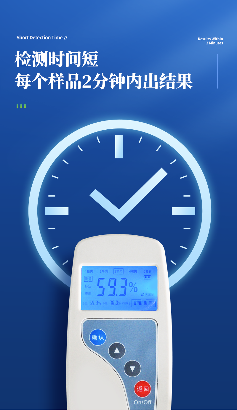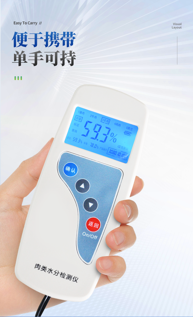 肉類水分檢測儀主要用于快速豬肉、牛肉、雞肉等動物肉類水分含量,從而判斷所測樣品是否為注水肉,該儀器設計精巧,單手可持,儀器可根據(jù)測定對象的品種,設定相應的判斷標準值。