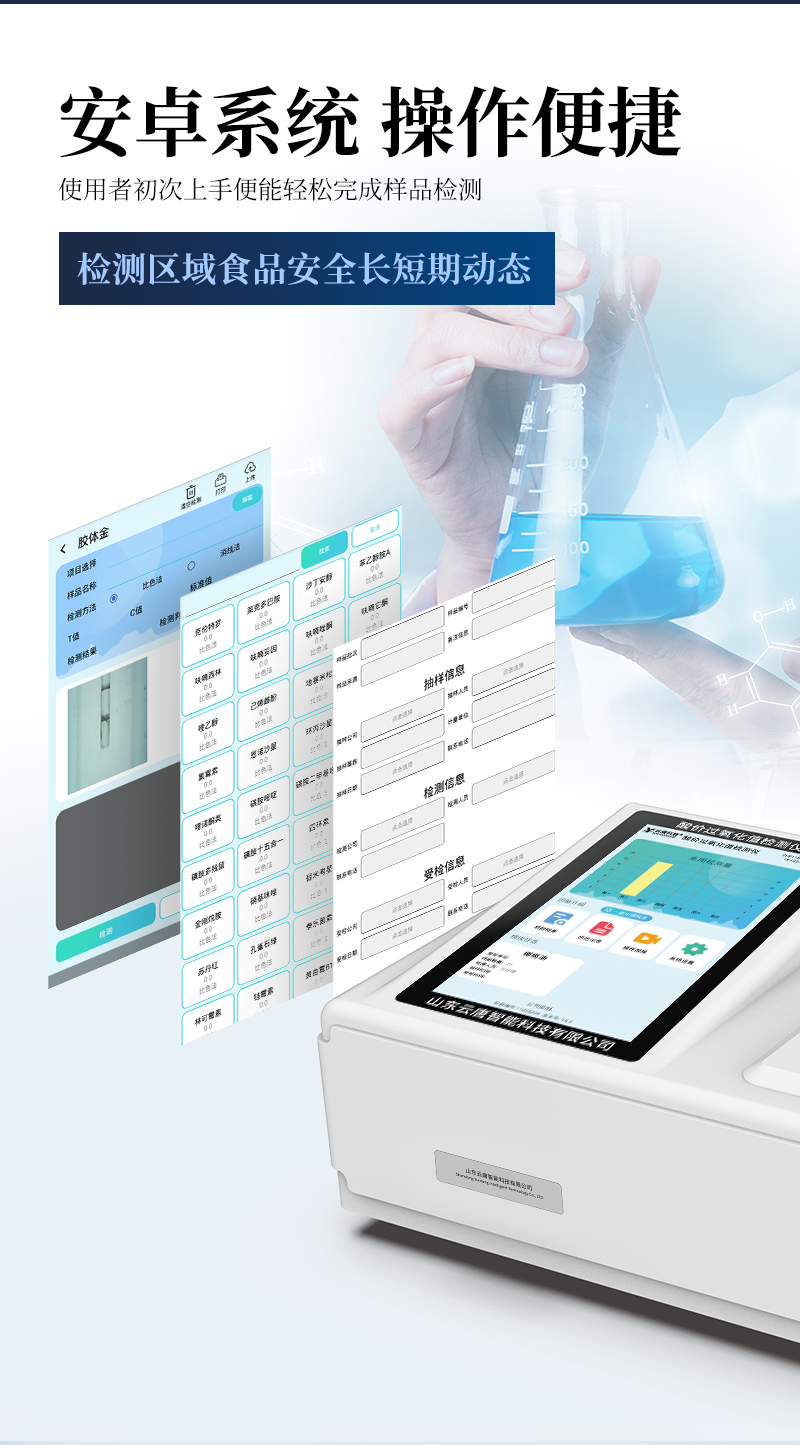 9.6、數(shù)據(jù)監(jiān)管系統(tǒng):同步對接監(jiān)管平臺,數(shù)據(jù)可局域網(wǎng)和互聯(lián)網(wǎng)數(shù)據(jù)上傳,檢測結(jié)果可選擇直接傳至食品安全監(jiān)管平臺。進行區(qū)域食品安全監(jiān)管及大數(shù)據(jù)分析處理與數(shù)據(jù)統(tǒng)計,檢測區(qū)域食品安全長短期動態(tài),達到食品安全問題預(yù)估、預(yù)警。