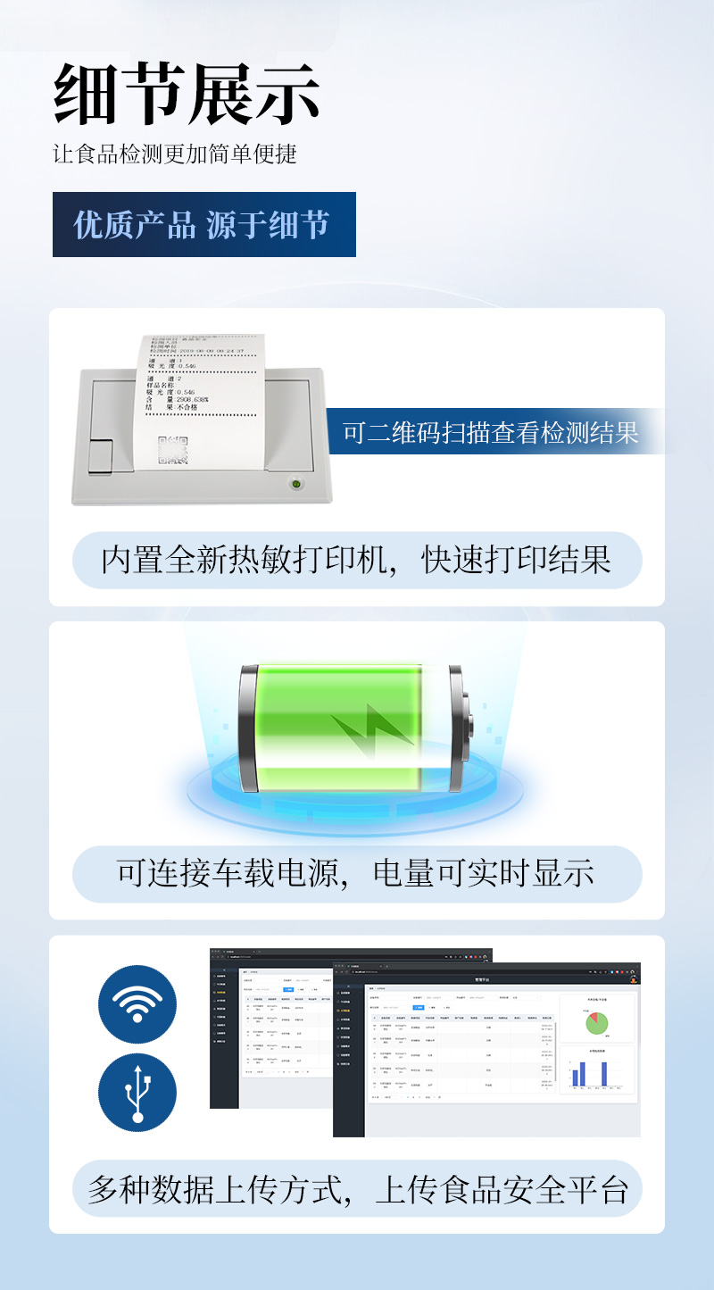 1、儀器采用臺式一體化系統(tǒng)檢測技術(shù),將分光光度模塊、數(shù)字化管理模塊、無線通訊模塊高度集成于一體,可支持檢測60種食品安全檢測項目,同時預(yù)留升級檢測方法。