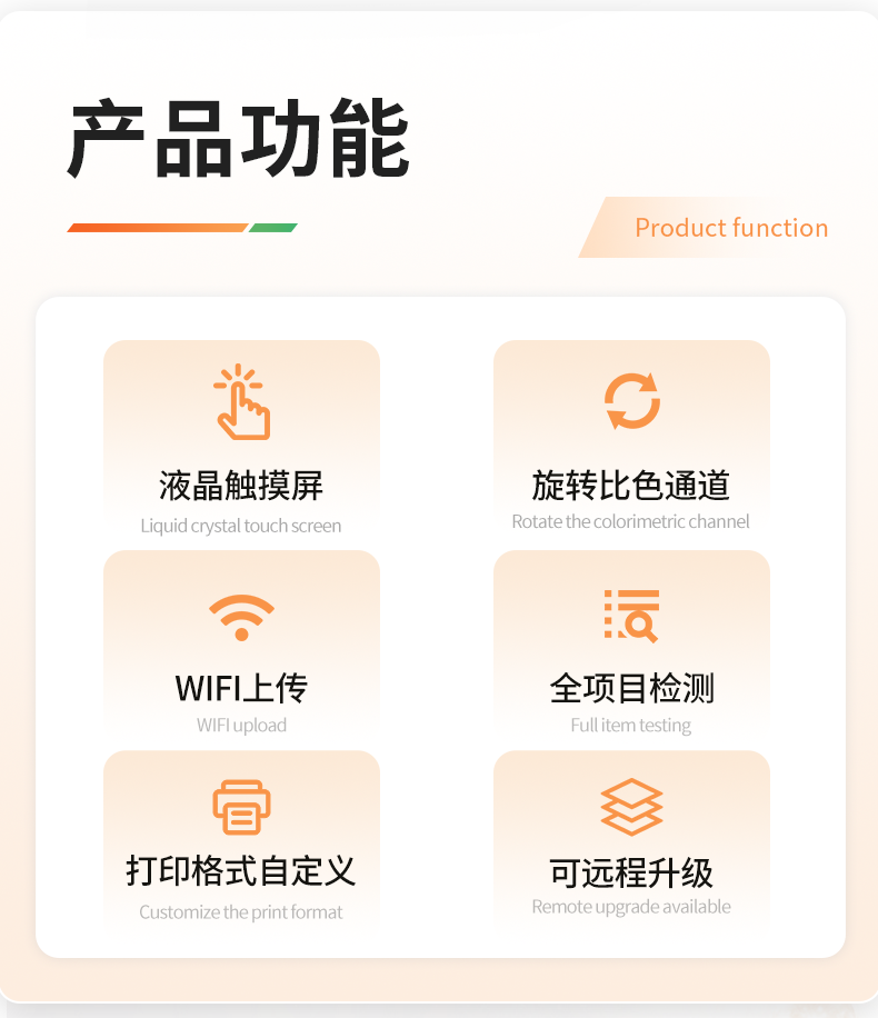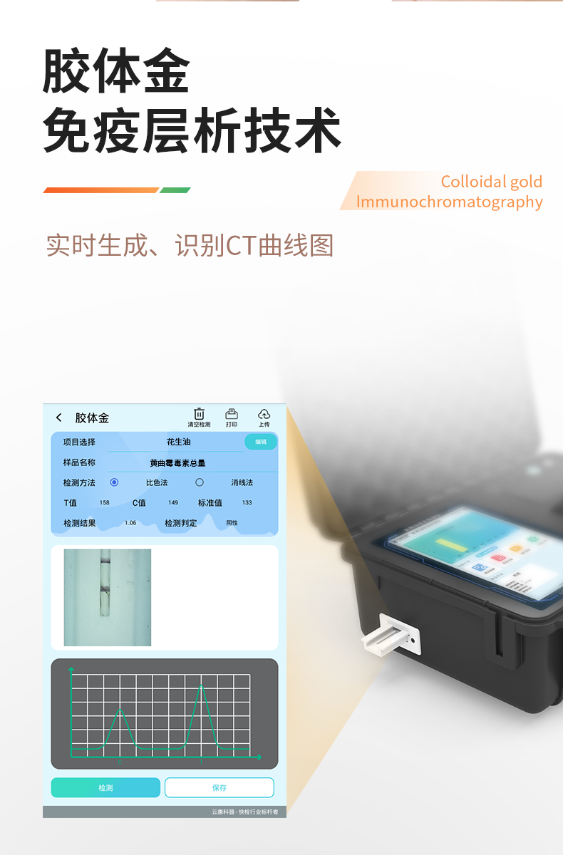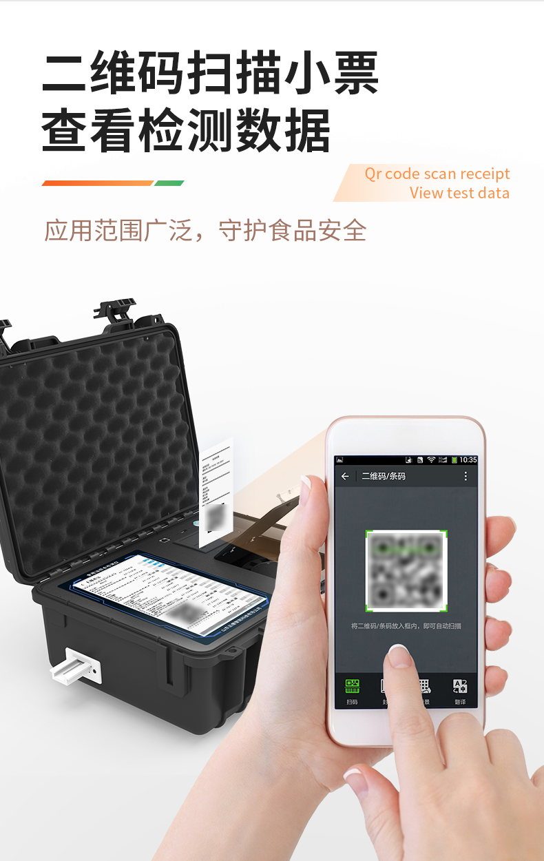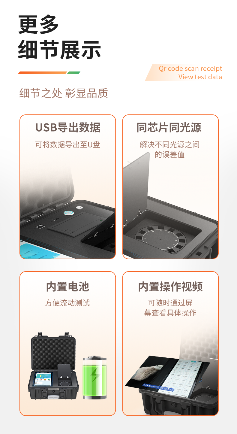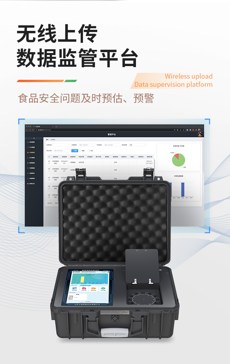 | 1、儀器采用手提一體化系統(tǒng)檢測技術(shù),將分光光度模塊、膠體金檢測模塊、新型農(nóng)殘檢測模塊、數(shù)字化管理模塊、無線通訊模塊高度集成于一體,支持檢測200種食品安全檢測項目,同時預(yù)留升級檢測方法。 | 2、儀器檢測模塊標(biāo)準(zhǔn)化、智能化,檢測項目可隨意自由組合。檢測箱體內(nèi)置多個標(biāo)準(zhǔn)檢測單元,檢測模塊可以調(diào)整配置。 | 3、顯示屏幕:儀器采用10.1英寸豎向液晶觸摸屏顯,搭配運行安卓智能操作系統(tǒng),主控芯片采用ARM Cortex-A7,RK3288/4核處理器,主頻1.88Ghz,操作方便,性能更強。 | 4、檢測通道:≥12通道;采用精密旋轉(zhuǎn)比色池設(shè)計,使用同芯片同光源校準(zhǔn)精度,解決不同光源之間的誤差值,更加準(zhǔn)確**。(1-12通道間誤差0.1%,**號:**202022821055.2) | 5、儀器光源:高精度進口四波長冷光源,每個通道均配置 410、520、590、630nm 波長光源,標(biāo)配**的光路切換裝置,**光路切換功能可實現(xiàn)64波長,并且所有檢測項目可實現(xiàn)所有通道同時檢測。 | 6、設(shè)備可一鍵校準(zhǔn),自動保存校準(zhǔn)數(shù)據(jù),自動對比校驗,得到精準(zhǔn)光源,采用Android SP存儲數(shù)據(jù),光源數(shù)據(jù)永不丟失,方便每一次使用。 | 7、通訊接口:配備無線通信模塊、4G(APN)通訊模塊、藍牙傳輸,同時具有雙USB接口以及RJ45網(wǎng)線接口,可以多方式實現(xiàn)數(shù)據(jù)保存及數(shù)據(jù)傳輸。 | 8、存儲方式:支持U盤存儲,標(biāo)準(zhǔn)USB接口,免驅(qū)動安裝。檢測結(jié)果存儲容量20萬條以上,可生成Excel表格進行拷貝,并具有登錄保護功能。 | 9、智能化操作系統(tǒng): | 9.1、操作系統(tǒng):儀器可在同一檢測界面自動對應(yīng)相關(guān)檢測通道,一次性選擇1-12個樣品名稱,無需退出界面,節(jié)省操作時間。并可以對每個通道屬性和樣品信息單獨進行編輯,例如送檢單位、人員,檢測人員等,打印時勾選打印顯示。 | 9.2、數(shù)據(jù)集成系統(tǒng):設(shè)備首頁自動匯總分析檢測數(shù)據(jù),包含:周檢測數(shù)據(jù)、月檢測數(shù)據(jù),全部檢測總數(shù)量,包含檢測總數(shù),合格數(shù),不合格數(shù),以及相關(guān)柱形分析圖,各項檢測數(shù)據(jù)一目了然,無需電腦查詢,更加快捷直觀。 | 9.3、數(shù)據(jù)庫系統(tǒng):十幾項數(shù)據(jù)庫分類管理儀器:包含項目類型、項目數(shù)據(jù)、檢測數(shù)據(jù)、歷史記錄、國標(biāo)信息、曲線信息、采樣信息、檢測信息、受檢信息、復(fù)核信息、圖表信息、光源校準(zhǔn)信息、打印樣式信息、樣品庫信息等等,數(shù)據(jù)庫之間互相協(xié)調(diào)聯(lián)動保證數(shù)據(jù)的真實完整性。同時產(chǎn)品數(shù)據(jù)庫以及歷史檢測記錄支持一鍵檢索功能。 | 9.4、限量規(guī)判系統(tǒng):具有限量查詢、添加物質(zhì)合規(guī)判定系統(tǒng)。檢測出結(jié)果后,系統(tǒng)自動調(diào)用系統(tǒng)數(shù)據(jù)庫中相關(guān)國標(biāo)進行比對判定,客觀顯示判定結(jié)果是否合格。 | 9.5、項目預(yù)設(shè)系統(tǒng):儀器具有任務(wù)預(yù)設(shè)模塊,一鍵提前預(yù)設(shè),給出方便快捷的新檢測方案,每一個任務(wù)分別可以設(shè)置不同的樣品、批次、編號、來源、備注、抽樣信息、檢測信息、受檢信息、復(fù)核信息等更多信息。樣品送檢時一鍵調(diào)取保存信息,并可多次調(diào)取,大大提高檢測效率。 | 9.6、數(shù)據(jù)監(jiān)管系統(tǒng):同步對接監(jiān)管平臺,數(shù)據(jù)可局域網(wǎng)和互聯(lián)網(wǎng)數(shù)據(jù)上傳,檢測結(jié)果可直接傳至食品安全監(jiān)管平臺。進行區(qū)域食品安全監(jiān)管及大數(shù)據(jù)分析處理與數(shù)據(jù)統(tǒng)計,監(jiān)測區(qū)域食品安全長短期動態(tài)及問題預(yù)估、預(yù)警。 | 9.7.1、全新打印系統(tǒng):內(nèi)置全新打印機,新創(chuàng)自定義打印方式,可按需靈活勾選控制:產(chǎn)品合格證(國家農(nóng)業(yè)部標(biāo)準(zhǔn)要求),二維碼,抽樣信息、檢測信息,受檢信息、復(fù)核信息、抽樣日期、檢測日期等信息的打印。 | 9.7.2、A4紙版本報告打印功能(可選配):設(shè)備擁有兩種結(jié)果展示方式,可以自動生成A4打印模板和小票打印模板兩種樣式,可通過WiFi及網(wǎng)線等方式鏈接外置打印機可進行打印。 | 10、供電模式:儀器交直流兩用,直流12V供電,可連接車載電源,配6ah大容量充電鋰電池,電量可實時顯示,方便戶外流動測試。 | 11、膠體金檢測模塊:采用單通道CMOS成像處理技術(shù)及膠體金免疫層析技術(shù),可讀取膠體金卡數(shù)據(jù),自動采集、處理分析,將檢測結(jié)果顯示,并可根據(jù)參考限值自動判斷檢測結(jié)果,可檢測常見的獸藥殘留、生物毒素、抗生素、違禁添加物等。 | 11.1、探測技術(shù):CMOS成像探測; | 11.2、檢測通道:1個通道; | 11.3、檢測方式:消線法和比色法; | 11.4、顯示模式:陰性或陽性; | 11.5、曲線形式:軌道式掃描方式,顯示金標(biāo)卡圖像,實時生成、識別CT曲線圖,無需手動調(diào)整,完成檢測后自動退出檢測卡。兼容市場上其他金標(biāo)卡,使用耗材不受限制。 | 12、儀器具備遠(yuǎn)程升級功能,可定向分客戶分儀器更新,開機后自動更新,并可持續(xù)性免費更新系統(tǒng)版本,無需像傳統(tǒng)產(chǎn)品返廠更