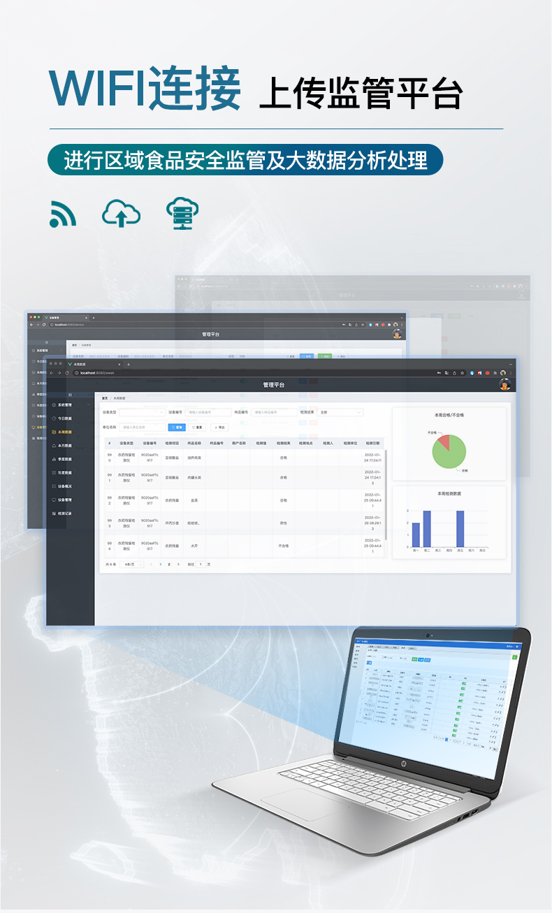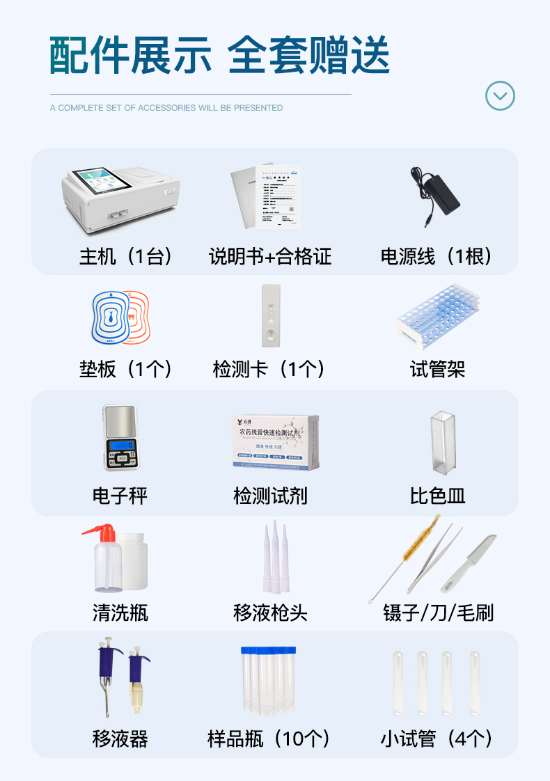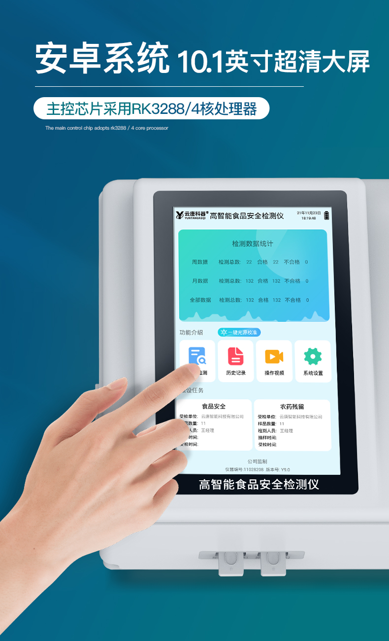 | 儀器采用臺(tái)式一體化系統(tǒng)檢測技術(shù),將分光光度模塊、數(shù)字化管理模塊、無線通訊模塊高度集成于一體,可支持檢測60種食品安全檢測項(xiàng)目,同時(shí)預(yù)留升級(jí)檢測方法。 | 儀器檢測模塊標(biāo)準(zhǔn)化、智能化,檢測項(xiàng)目可隨意自由組合。檢測箱體內(nèi)置多個(gè)標(biāo)準(zhǔn)檢測單元,檢測模塊可以調(diào)整配置。 | 顯示屏幕:儀器采用10.1英寸液晶觸摸屏顯,搭配運(yùn)行安卓智能操作系統(tǒng),主控芯片采用ARM Cortex-A7,RK3288/4核處理器,主頻1.88Ghz,運(yùn)轉(zhuǎn)速度更快速,性能更強(qiáng)。 | 檢測通道:≥12通道;采用精密旋轉(zhuǎn)比色池設(shè)計(jì),使用光源芯片一致,可以解決各通道間由于光源芯片不同帶來的檢測結(jié)果誤差問題,檢測結(jié)果更加精準(zhǔn),1-12通道間誤差0.1%,**號(hào):**202022821055.2。 | 儀器光源:高精度進(jìn)口四波長冷光源,每個(gè)通道均配置 410、520、590、630nm 波長光源,標(biāo)配**的光路切換裝置,**光路切換功能可實(shí)現(xiàn)*多64波長,并且所有檢測項(xiàng)目可實(shí)現(xiàn)所有通道同時(shí)檢測 | 設(shè)備具備開機(jī)自動(dòng)校準(zhǔn)及一鍵校準(zhǔn)功能,確保檢測數(shù)據(jù)結(jié)果準(zhǔn)確。 | 通訊接口:配備無線通信模塊、4G(APN)通訊模塊、藍(lán)牙傳輸,同時(shí)具有雙USB接口以及RJ45網(wǎng)線接口,可以多方式實(shí)現(xiàn)數(shù)據(jù)保存及數(shù)據(jù)傳輸。 | 存儲(chǔ)方式:支持U盤存儲(chǔ),標(biāo)準(zhǔn)USB接口,免驅(qū)動(dòng)安裝。檢測結(jié)果存儲(chǔ)容量20萬條以上,可生成Excel表格進(jìn)行拷貝,并具有登錄保護(hù)功能。 | 智能化操作系統(tǒng): 操作系統(tǒng):可在同一檢測界面自動(dòng)對(duì)應(yīng)相關(guān)檢測通道,一次性選擇1-12個(gè)樣品名稱,無需退出界面,節(jié)省操作時(shí)間。檢測通道可以分別打開與關(guān)閉并對(duì)檢測通道屬性和樣品信息進(jìn)行編輯,例如送檢單位、人員,檢測人員等,打印時(shí)一并顯示。 數(shù)據(jù)集成系統(tǒng):設(shè)備首頁自動(dòng)統(tǒng)計(jì)檢測數(shù)據(jù),包含:周檢測數(shù)據(jù)、月檢測數(shù)據(jù),全部檢測總數(shù)量,均包含檢測總數(shù),合格數(shù),不合格數(shù),以及相關(guān)柱形分析圖,對(duì)各項(xiàng)檢測數(shù)據(jù)清晰掌握,無需電腦查詢,更加快捷直觀。 數(shù)據(jù)庫系統(tǒng):具有多品類多種類樣品菜單功能,并且構(gòu)建了完善的檢索、修訂功能。食品庫涵蓋多種菜單庫100多種蔬菜名稱,可按需添加或刪除、編輯蔬菜名稱;不同的檢測通道可同時(shí)檢測不同的樣品,產(chǎn)品數(shù)據(jù)庫以及歷史檢測記錄支持一鍵檢索功能。 限量規(guī)判系統(tǒng):具有限量查詢、添加物質(zhì)合規(guī)判定系統(tǒng)。檢測出結(jié)果后,系統(tǒng)自動(dòng)調(diào)用系統(tǒng)數(shù)據(jù)庫中相關(guān)國標(biāo)進(jìn)行比對(duì)判定,客觀顯示判定結(jié)果是否合格。 項(xiàng)目預(yù)設(shè)系統(tǒng):儀器具有任務(wù)預(yù)設(shè)模塊,可在樣品送檢前提前預(yù)設(shè)樣品名稱、檢測指標(biāo)、送檢單位、檢測單位等信息,樣品送檢時(shí)一鍵調(diào)取保存信息,并可多次調(diào)取,大大提高檢測效率。 數(shù)據(jù)監(jiān)管系統(tǒng):同步對(duì)接監(jiān)管平臺(tái),數(shù)據(jù)可局域網(wǎng)和互聯(lián)網(wǎng)數(shù)據(jù)上傳,檢測結(jié)果可選擇直接傳至食品安全監(jiān)管平臺(tái)。進(jìn)行區(qū)域食品安全監(jiān)管及大數(shù)據(jù)分析處理與數(shù)據(jù)統(tǒng)計(jì),檢測區(qū)域食品安全長短期動(dòng)態(tài),達(dá)到食品安全問題預(yù)估、預(yù)警。 自定義打印系統(tǒng):內(nèi)置熱敏打印機(jī);系統(tǒng)打印格式多樣化,產(chǎn)品合格證(國家農(nóng)業(yè)部標(biāo)準(zhǔn)要求),二維碼,抽樣信息、檢測信息,受檢信息、復(fù)核信息、抽樣日期、檢測日期等信息結(jié)果,可按實(shí)際需求自行設(shè)置開啟或關(guān)閉,并完成打印。 | 供電模式:儀器交直流兩用,直流12V供電,可連接車載電源,可配6ah大容量充電鋰電池,電量可實(shí)時(shí)顯示,方便戶外流動(dòng)測試。 | 儀器具備遠(yuǎn)程升級(jí)功能,可定向分客戶分儀器更新,開機(jī)后自動(dòng)更新,并可持續(xù)性免費(fèi)更新系統(tǒng)版本,無需像傳統(tǒng)產(chǎn)品返廠更新,節(jié)省時(shí)間及人力成本并避免了物流運(yùn)輸返廠升級(jí)導(dǎo)致設(shè)備損壞的潛在風(fēng)險(xiǎn)。 |