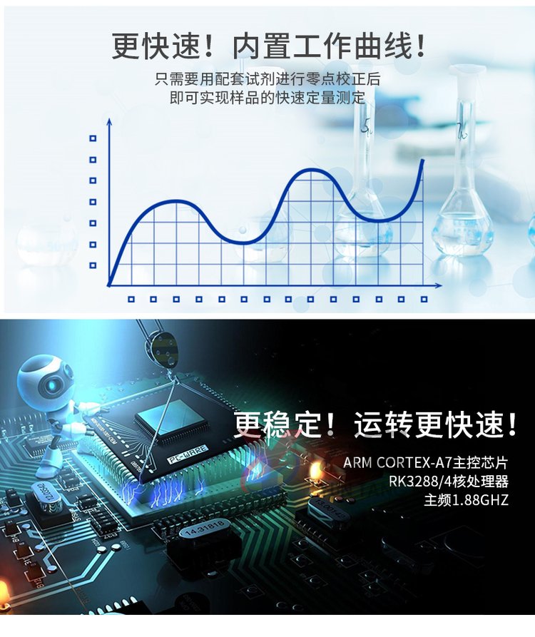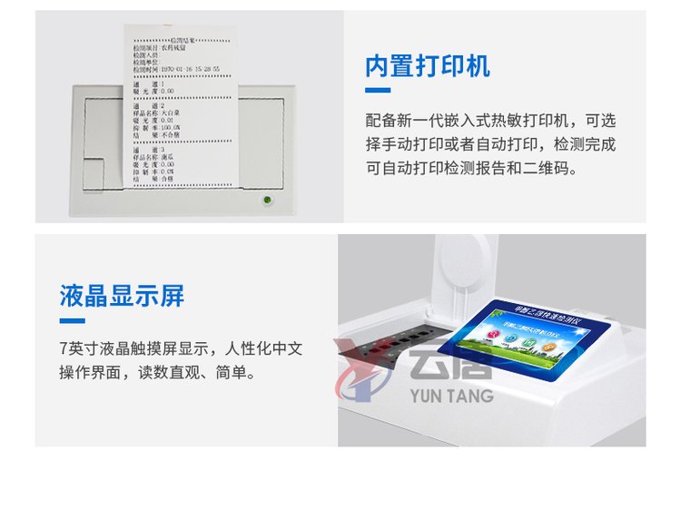 1、儀器采用臺式一體化系統(tǒng)檢測技術,將分光光度模塊、數(shù)字化管理模塊、無線通訊模塊高度集成于一體,支持檢測200種食品安全檢測項目,同時預留升級檢測方法。