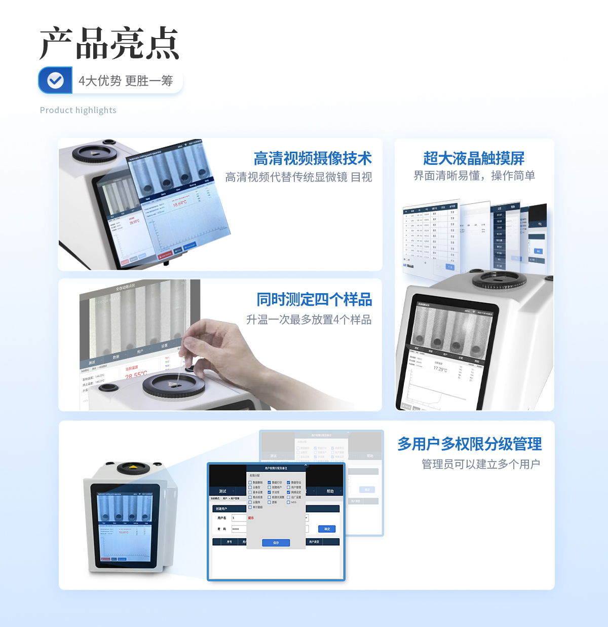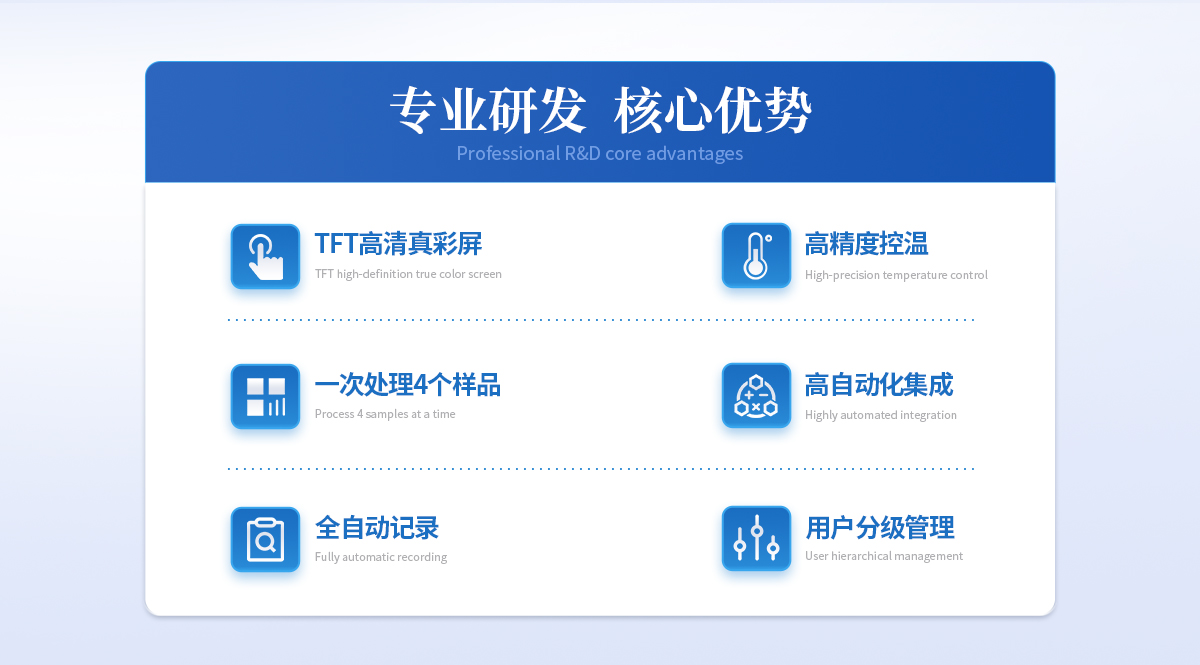 | 1、自動化集成,實現(xiàn)一鍵測定功能; | 2、一次處理4個樣品; | 3、高清視頻代替?zhèn)鹘y(tǒng)顯微鏡 目視高; | 4、半自動記錄熔程,初熔,終熔; | 5、可通過打印機直接打印數(shù)據(jù); | 6、符合21CFR Part 11、審計追蹤、藥典及電子簽名 | 7、符合GLP要求規(guī)范; | 8、符合藥典2015。 |