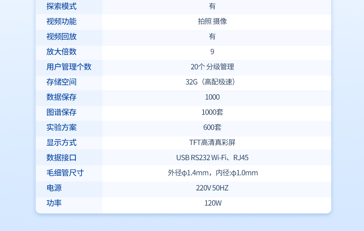 | 溫度范圍: 室溫-350℃ | 檢測方式: 半自動/手動 | 處理能力: 4個/批(同時可以做四個樣) | 判斷能力: 視頻目視 | 溫度分辨率:0.1℃ | 升溫速率: 0.1℃--20℃ (200檔 無極可調) | 控溫方式: PID**控溫 爐體全密閉設計 | 加熱方式: 傳導液加熱法或者電熱塊空氣加熱法(選配) | 升溫分辨率:0.1℃ | 升溫速率: 0.1℃/Min-:20℃/Min | 準確度: ±0.3℃(<200℃),±0.5℃(>200℃) | 重復性: 0.1℃/Min時熔點重復性±0.1℃ | 校正功能: 具備 | 探索模式: 有 | 視頻回放: 有/有時間水印 | 高清攝像頭:觀察樣品熔融狀態(tài) | 放大倍數(shù): ≥10 | 用戶管理個數(shù):30個以上 分級三級管理 | 存儲空間: 32G硬盤,≥2G內存 | 試驗方法: 有 | 數(shù)據(jù)保存: 32G | 圖譜保存: 200 | 內存擴展: 可以 | 實驗方法儲存量:50套 | 審計追蹤: 有 | 網 絡: 無線WIFI | 顯示方式: 8寸高清彩屏 | 數(shù)據(jù)接口: USB,網絡WiFi接口,RS232 | 數(shù)據(jù)真實性:防篡改功能 | 數(shù)據(jù)導出: 可用U盤導出 | 數(shù)據(jù)輸出形式:PDF格式和EXCL數(shù)據(jù) | 數(shù)據(jù)溢出提醒:提前自動提醒 | 打印機: 選配激光打印機或熱敏/針式(兼容) | 毛細管尺寸:外徑φ1.4mm,內徑:φ1.0mm | 電源:220V 50HZ 功率:120W |