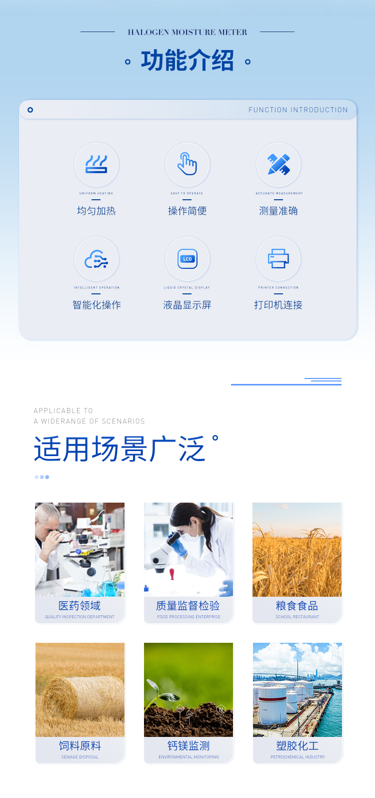 鹵素水分儀用于如:醫(yī)藥、塑膠、化工、食品、糧食、飼料、鈣鎂、質(zhì)量監(jiān)督檢驗、等各行業(yè)中的生產(chǎn)過與實驗過程中, 具有良好重現(xiàn)性的水分測定結(jié)果;清晰的按鍵和水分測定信息顯示,實現(xiàn)直觀簡單地儀器操作;創(chuàng)新的預先存儲的16種不同樣品水分測定方法數(shù)據(jù)庫,使得測試方法的開發(fā)快速、簡單